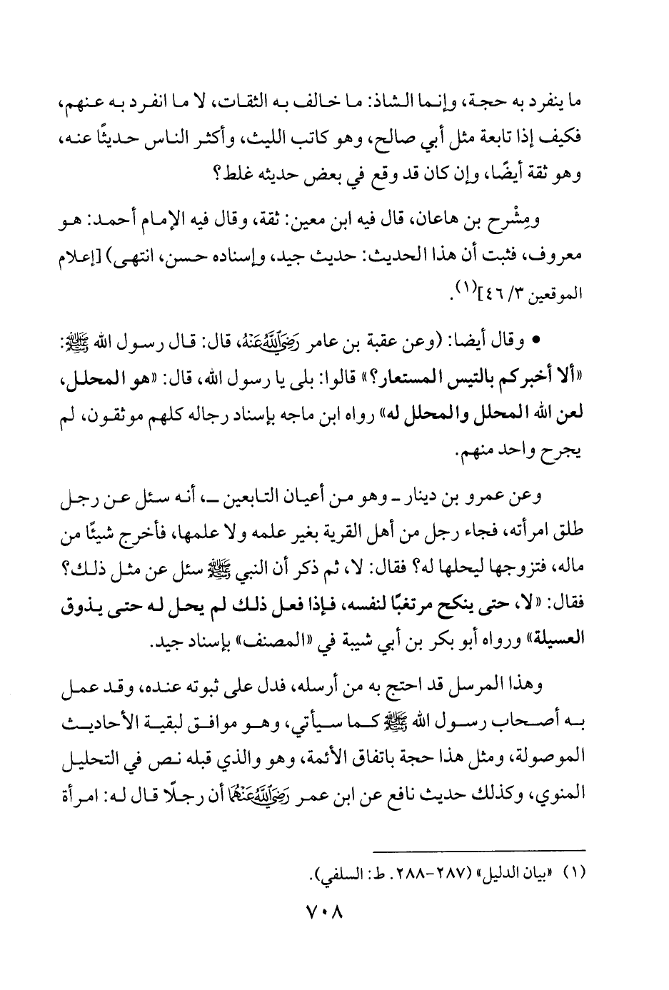 * وقال أيضًا: (وعن عقبة بن عامر - رضي الله عنه -، قال: قال رسول الله - صلى الله عليه وسلم -: "ألا أخبركم بالتيس المستعار؟ " قالوا: بلى يا رسول الله، قال: "هو المحلل، لعن الله المحلل والمحلل له" رواه ابن ماجه بإسناد رجاله كلهم موثقون، لم يجرح واحد منهم.