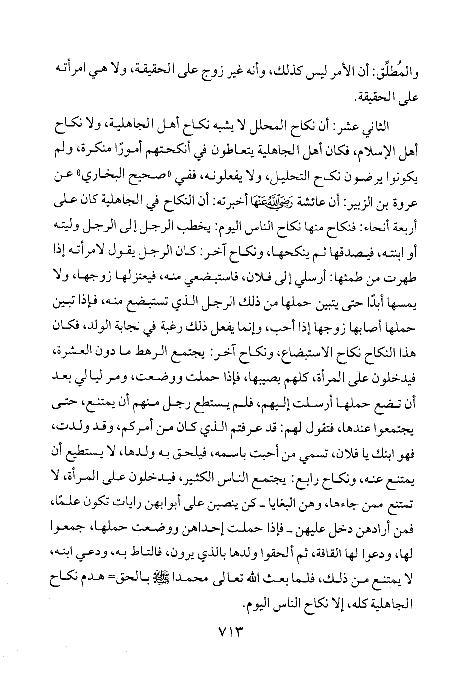 الثاني عشر: أن نكاح المحلل لا يشبه نكاح أهل الجاهلية، ولا نكاح أهل الإسلام، فكان أهل الجاهلية يتعاطون في أنكحتهم أمورًا منكرة، ولم يكونوا يرضون نكاح التحليل، ولا يفعلونه، ففي "صحيح البخاري" عن عروة بن الزبير: أن عائشة - رضي الله عنها - أخبرته: أن النكاح في الجاهلية كان على أربعة أنحاء: فنكاح منها نكاح الناس اليوم: يخطب الرجل إلى الرجل وليته أو ابنته، فيصدقها ثم ينكحها، ونكاح آخر: كان الرجل يقول لامرأته إذا طهرت من طمثها: أرسلي إلى فلان، فاستبضعي منه، فيعتزلها زوجها، ولا يمسها أبدًا حتى يتبين حملها من ذلك الرجل الذي تستبضع منه، فإذا تبين حملها أصابها زوجها إذا أحب، وإنما يفعل ذلك رغبة في نجابة الولد، فكان هذا النكاح نكاح الاستبضاع، ونكاح آخر: يجتمع الرهط ما دون العشرة، فيدخلون على المرأة، كلهم يصيبها، فإذا حملت ووضعت، ومر ليالي بعد أن تضع حملها أرسلت إليهم، فلم يستطع رجل منهم أن يمتنع، حتى يجتمعوا عندها، فتقول لهم: قد عرفتم الذي كان من أمركم، وقد ولدت، فهو ابنك يا فلان، تسمي من أحبت باسمه، فيلحق به ولدها، لا يستطيع أن يمتنع عنه، ونكاح رابع: يجتمع الناس الكثير، فيدخلون على المرأة، لا تمتنع ممن جاءها، وهن البغايا -كن ينصبن علي أبوابهن رايات تكون علمًا، فمن أرادهن دخل عليهن- فإذا حملت إحداهن ووضعت حملها، جمعوا لها، ودعوا لها القافة، ثم ألحقوا ولدها بالذي يرون، فالتاط به، ودعي ابنه، لا يمتنع من ذلك، فلما بعث الله تعالى محمدا - صلى الله عليه وسلم - بالحق = هدم نكاح الجاهلية كله، إلا نكاح الناس اليوم.