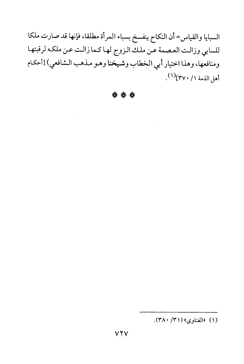 السبايا والقياس = أن النكاح ينفسخ بسباء المرأة مطلقا، فإنها قد صارت ملكا للسابي وزالت العصمة عن ملك الزوج لها كما زالت عن ملكه لرقبتها ومنافعها، وهذا اختيار أبي الخطاب وشيخنا وهو مذهب الشافعي) [أحكام أهل الذمة 1/ 370] (¬1).