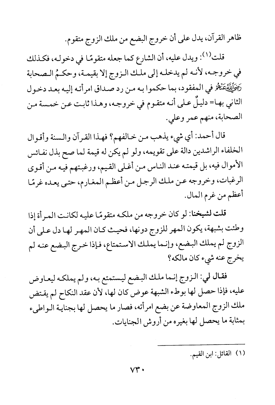 قلت (¬1): ويدل عليه، أن الشارع كما جعله متقومًا في دخوله، فكذلك في خروجه، لأنه لم يدخله إلى ملك الزوج إلا بقيمة، وحكمُ الصحابة - رضي الله عنهم - في المفقود، بما حكموا به من رد صداق امرأته إليه بعد دخول الثاني بها = دليل على أنه متقوم في خروجه، وهذا ثابت عن خمسة من الصحابة، منهم عمر وعلي.