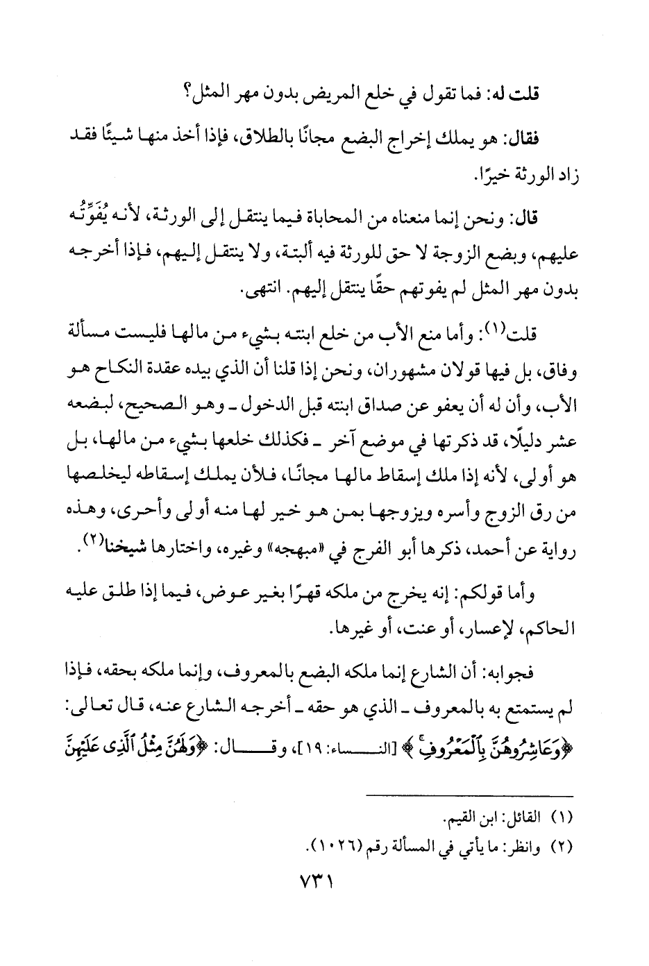 فقال: هو يملك إخراج البضع مجانًا بالطلاق، فإذا أخذ منها شيئًا فقد زاد الورثة خيرًا.