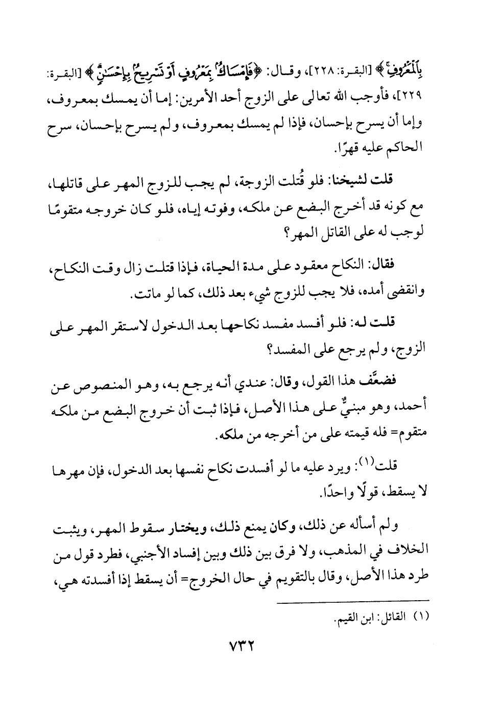 بِالْمَعْرُوفِ} [البقرة: 228]، وقال: {فَإِمْسَاكٌ بِمَعْرُوفٍ أَوْ تَسْرِيحٌ بِإِحْسَانٍ} [البقرة: 229]، فأوجب الله تعالى على الزوج أحد الأمرين: إما أن يمسك بمعروف، وإما أن يسرح بإحسان، فإذا لم يمسك بمعروف، ولم يسرح بإحسان، سرح الحاكم عليه قهرًا.
