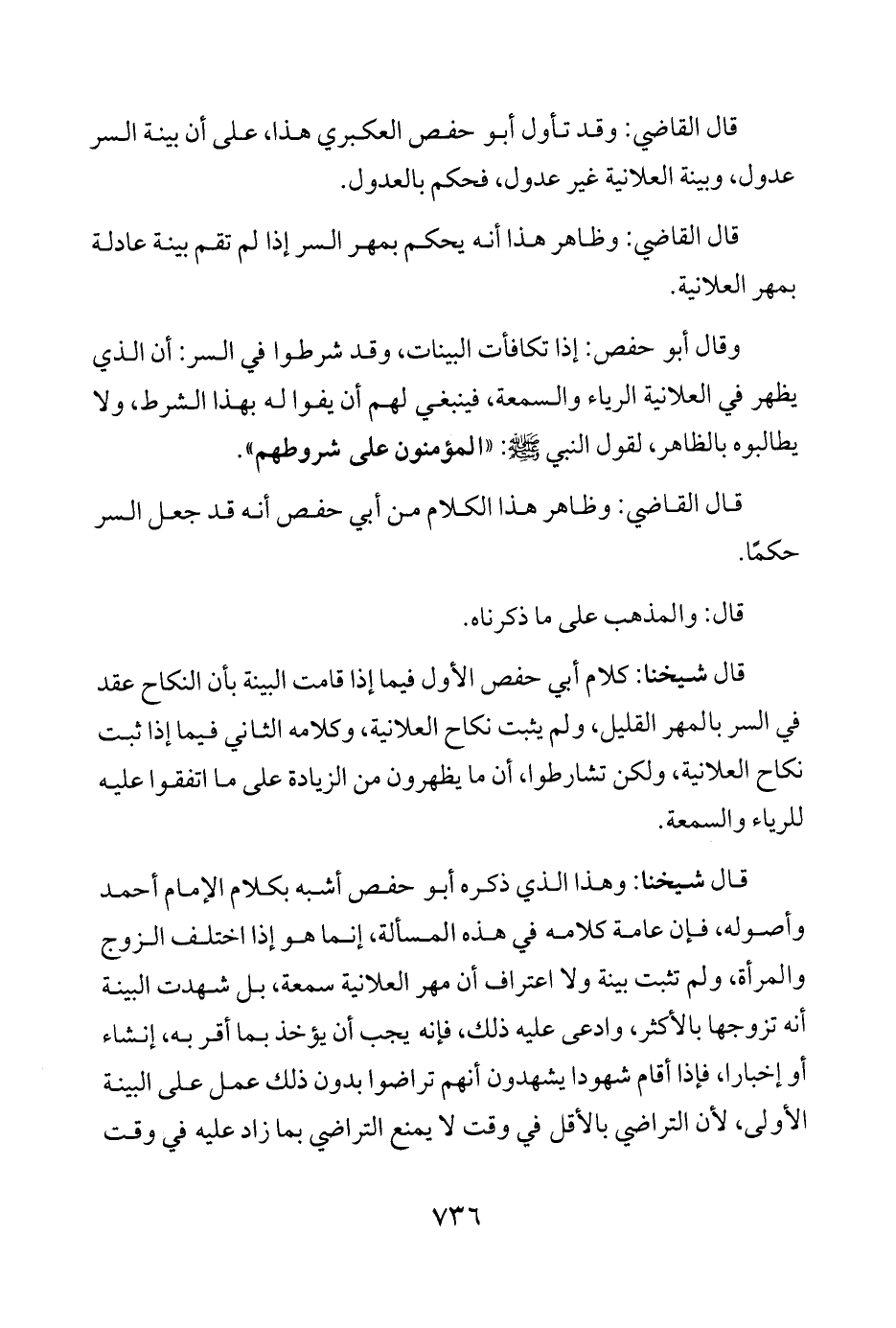 قال شيخنا: كلام أبي حفص الأول فيما إذا قامت البينة بأن النكاح عقد في السر بالمهر القليل، ولم يثبت نكاح العلانية، وكلامه الثاني فيما إذا ثبت نكاح العلانية، ولكن تشارطوا، أن ما يظهرون من الزيادة على ما اتفقوا عليه للرياء والسمعة.