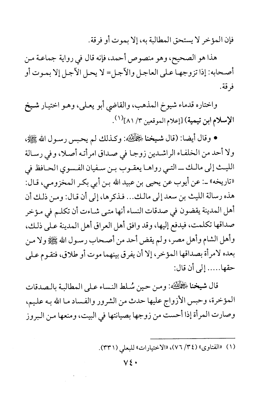 * وقال أيضًا: (قال شيخنا رحمهُ اللهُ: وكذلك لم يحبس رسول الله - صلى الله عليه وسلم -، ولا أحد من الخلفاء الراشدين زوجا في صداق امرأته أصلا، وفي رسالة الليث إلى مالك -التي رواها يعقوب بن سفيان الفسوي الحافظ في "تاريخه"-: عن أيوب عن يحيى بن عبيد الله بن أبي بكر المخزومي، قال: هذه رسالة الليث بن سعد إلى مالك ... فذكرها، إلى أن قال: ومن ذلك أن أهل المدينة يقضون في صدقات النساء أنها متى شاءت أن تكلم في مؤخر صداقها تكلمت، فيدفع إليها، وقد وافق أهل العراق أهل المدينة على ذلك، وأهل الشام وأهل مصر، ولم يقض أحد من أصحاب رسول الله - صلى الله عليه وسلم - ولا من بعده لامرأة بصداقها المؤخر، إلا أن يفرق بينهما موت أو طلاق، فتقوم على حقها. . إلى أن قال: