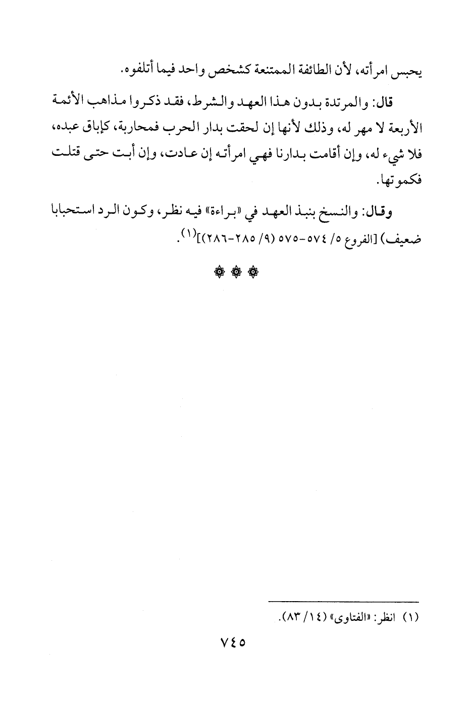 وقال: والنسخ بنبذ العهد في "براءة" فيه نظر، وكون الرد استحبابا ضعيف) [الفروع 5/ 574 - 575 (9/ 285 - 286)] (¬1).