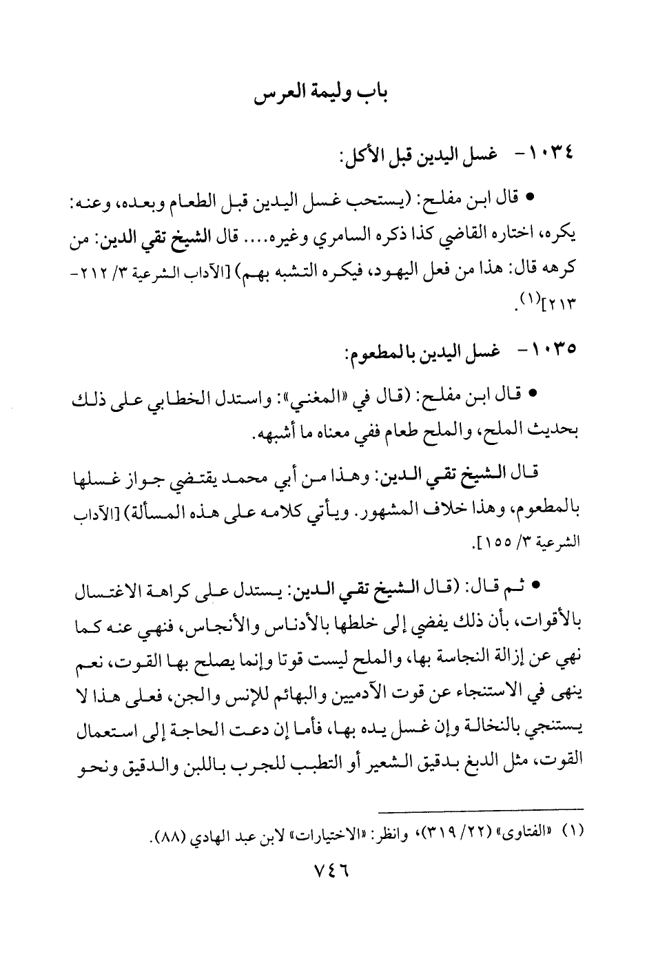 * قال ابن مفلح: (يستحب غسل اليدين قبل الطعام وبعده، وعنه: يكره، اختاره القاضي كذا ذكره السامري وغيره .... قال الشيخ تقي الدين: من كرهه قال: هذا من فعل اليهود، فيكره التشبه بهم) [الآداب الشرعية 3/ 212 - 213] (¬1).