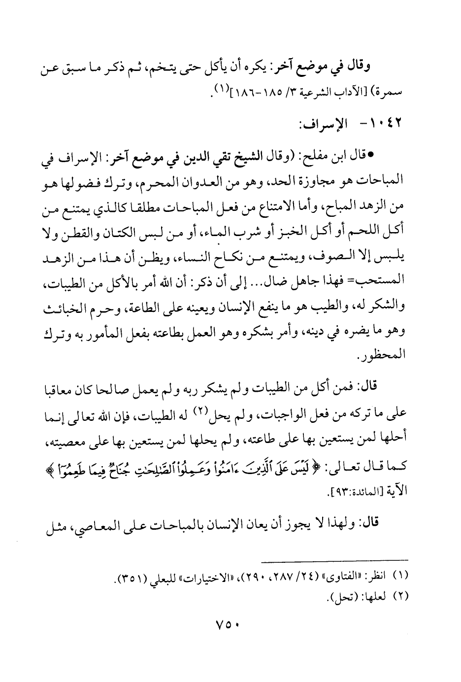 * قال ابن مفلح: (وقال الشيخ تقي الدين في موضع آخر: الإسراف في المباحات هو مجاوزة الحد، وهو من العدوان المحرم، وترك فضولها هو من الزهد المباح، وأما الامتناع من فعل المباحات مطلقا كالذي يمتنع من أكل اللحم أو أكل الخبز أو شرب الماء، أو من لبس الكتان والقطن ولا يلبس إلا الصوف، ويمتنع من نكاح النساء، ويظن أن هذا من الزهد المستحب = فهذا جاهل ضال ... إلى أن ذكر: أن الله أمر بالأكل من الطيبات، والشكر له، والطيب هو ما ينفع الإنسان ويعينه على الطاعة، وحرم الخبائث وهو ما يضره في دينه، وأمر بشكره وهو العمل بطاعته بفعل المأمور به وترك المحظور.