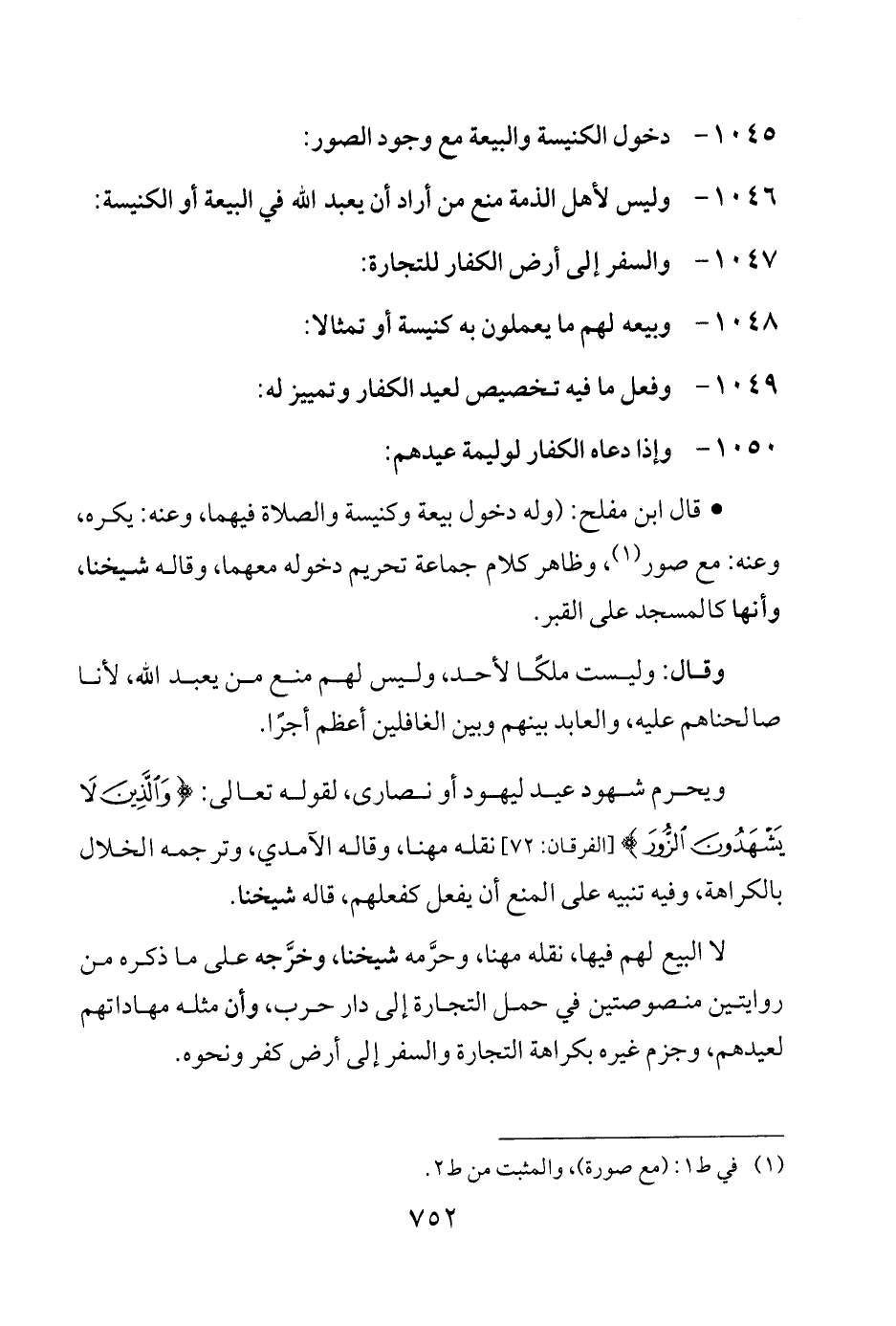 ويحرم شهود عيد ليهود أو نصارى، لقوله تعالى: {وَالَّذِينَ لَا يَشْهَدُونَ الزُّورَ} [الفرقان: 72] نقله مهنا، وقاله الآمدي، وترجمه الخلال بالكراهة، وفيه تنبيه على المنع أن يفعل كفعلهم، قاله شيخنا.