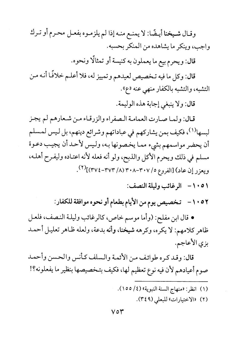 * قال ابن مفلح: (وأما موسم خاص، كالرغائب وليلة النصف، فلعل ظاهر كلامهم: لا يكره، وكرهه شيخنا، وأنه بدعة، ولعله ظاهر تعليل أحمد بزي الأعاجم.