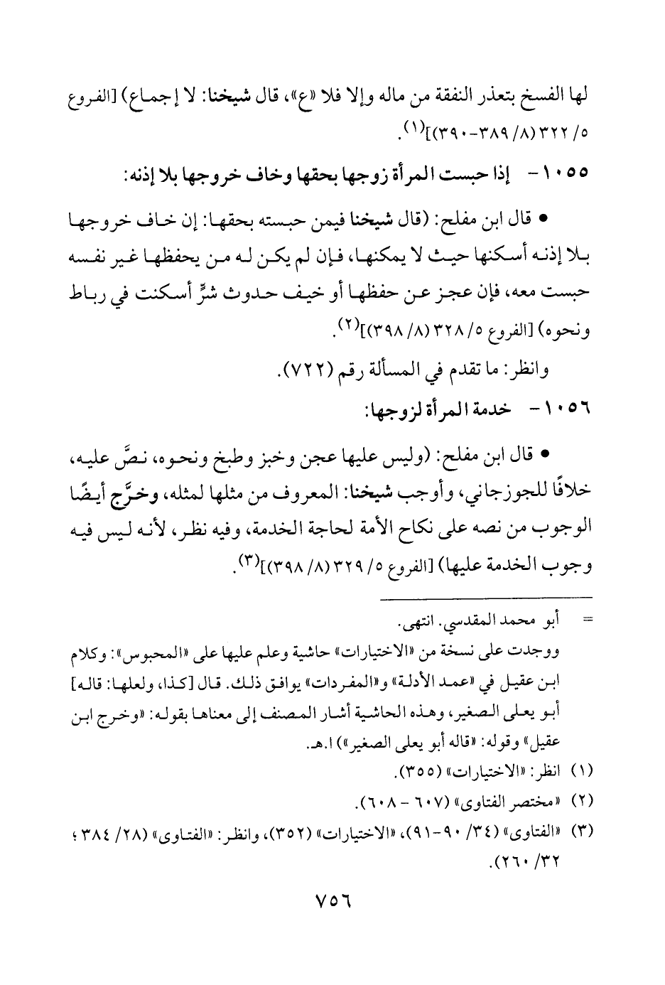 * قال ابن مفلح: (وليس عليها عجن وخبز وطبخ ونحوه، نصَّ عليه، خلافًا للجوزجاني، وأوجب شيخنا: المعروف من مثلها لمثله، وخرَّج أيضًا الوجوب من نصه على نكاح الأمة لحاجة الخدمة، وفيه نظر، لأنه ليس فيه وجوب الخدمة عليها) [الفروع 5/ 329) 8/ 398)] (¬3).