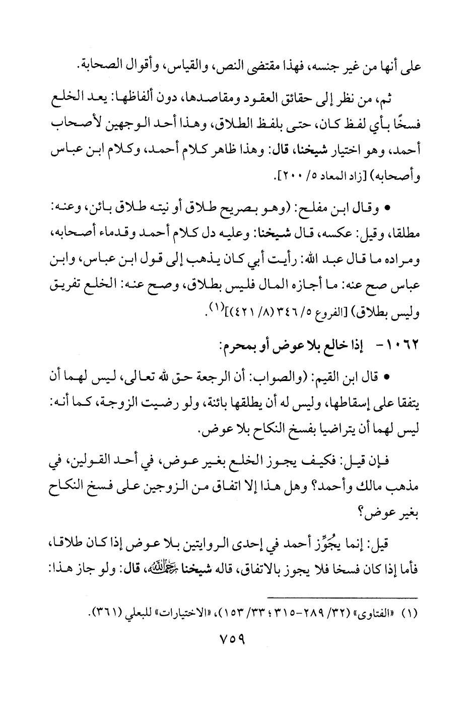 قيل: إنما يجوِّز أحمد في إحدى الروايتين بلا عوض إذا كان طلاقا، فأما إذا كان فسخا فلا يجوز بالاتفاق، قاله شيخنا -رحمه الله-، قال: ولو جاز هذا: