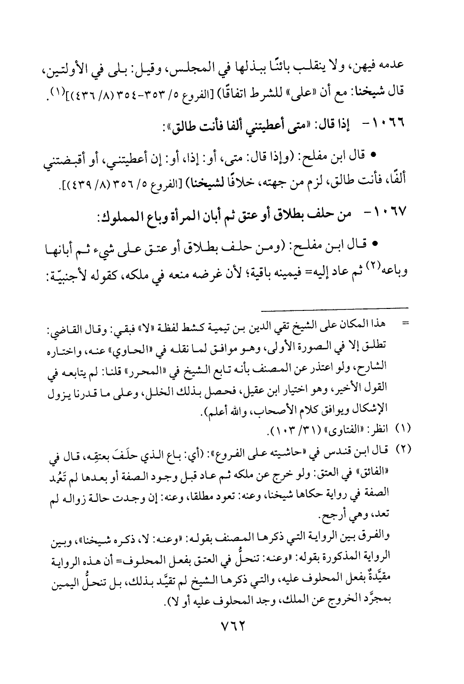 * قال ابن مفلح: (وإذا قال: متى، أو: إذا، أو: إن أعطيتني، أو أقبضتني ألفًا، فأنت طالق، لزم من جهته، خلافًا لشيخنا) [الفروع 5/ 356) 8/ 439)].
