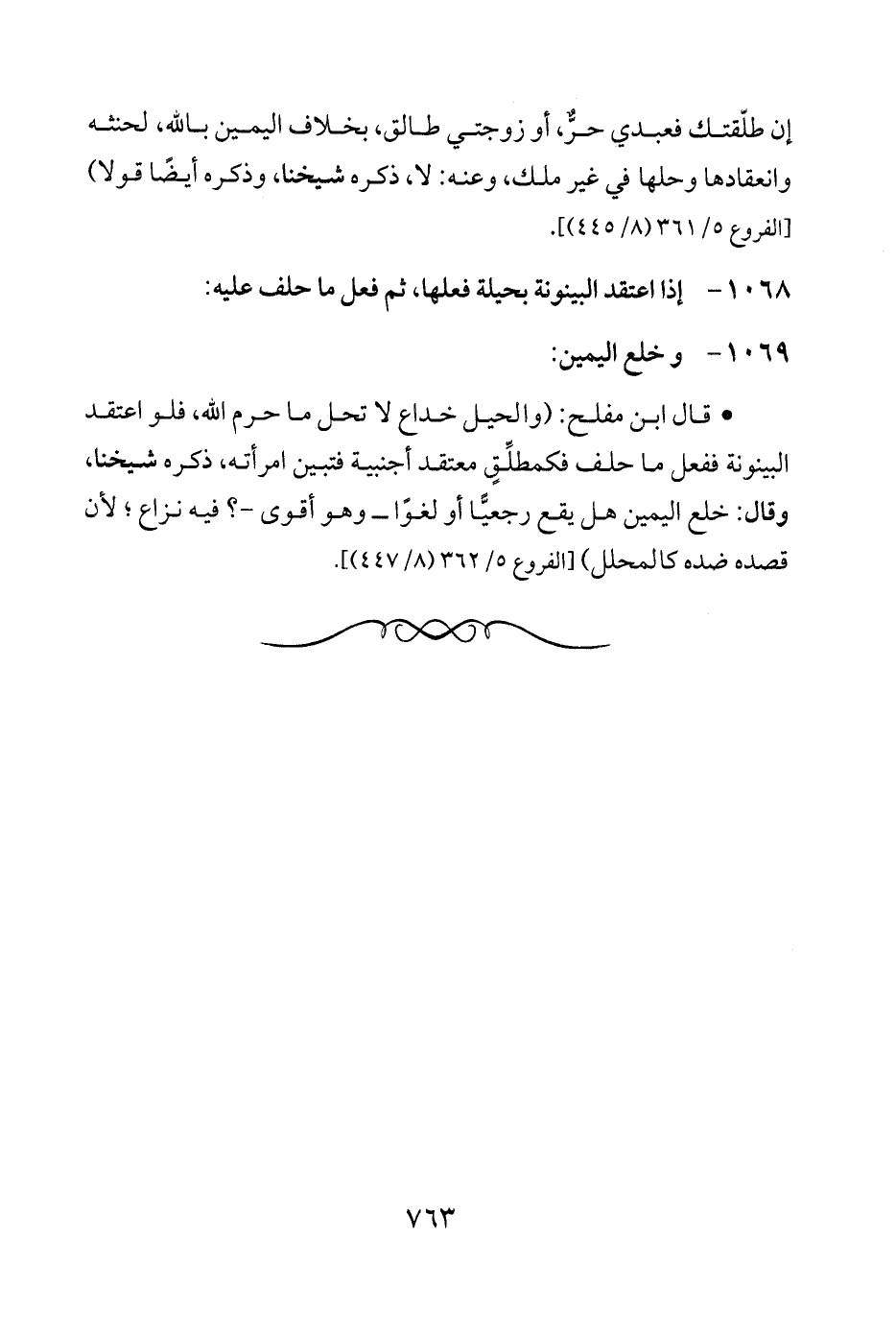 * قال ابن مفلح: (والحيل خداع لا تحل ما حرم الله، فلو اعتقد البينونة ففعل ما حلف فكمطلِّقٍ معتقد أجنبية فتبين امرأته، ذكره شيخنا، وقال: خلع اليمين هل يقع رجعيًّا أو لغوًا -وهو أقوى-؟ فيه نزاع؛ لأن قصده ضده كالمحلل) [الفروع 5/ 362) 8/ 447)].