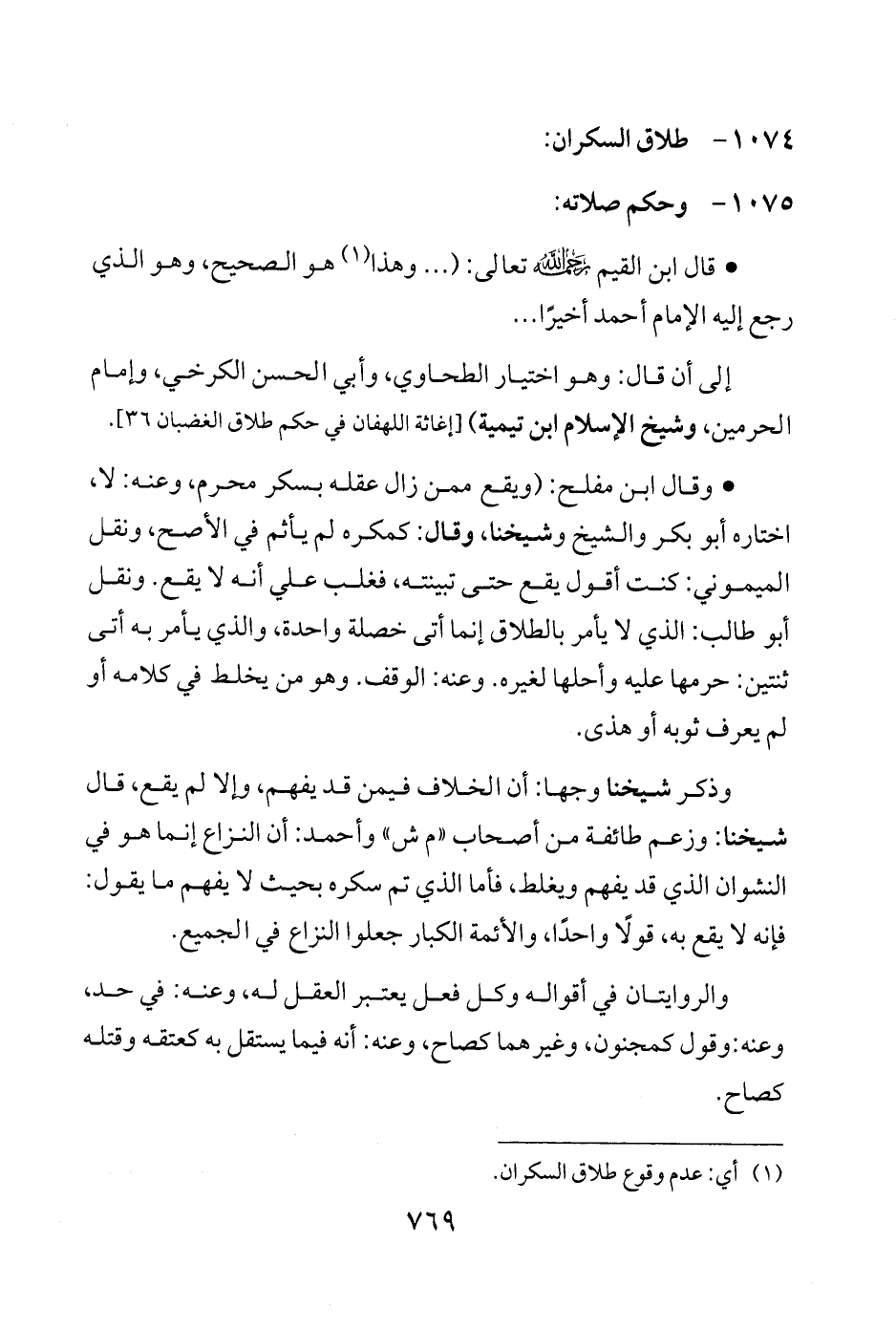 * وقال ابن مفلح: (ويقع ممن زال عقله بسكر محرم، وعنه: لا، اختاره أبو بكر والشيخ وشيخنا، وقال: كمكره لم يأثم في الأصح، ونقل الميموني: كنت أقول يقع حتى تبينته، فغلب علي أنه لا يقع. ونقل أبو طالب: الذي لا يأمر بالطلاق إنما أتى خصلة واحدة، والذي يأمر به أتى ثنتين: حرمها عليه وأحلها لغيره. وعنه: الوقف. وهو من يخلط في كلامه أو لم يعرف ثوبه أو هذى.