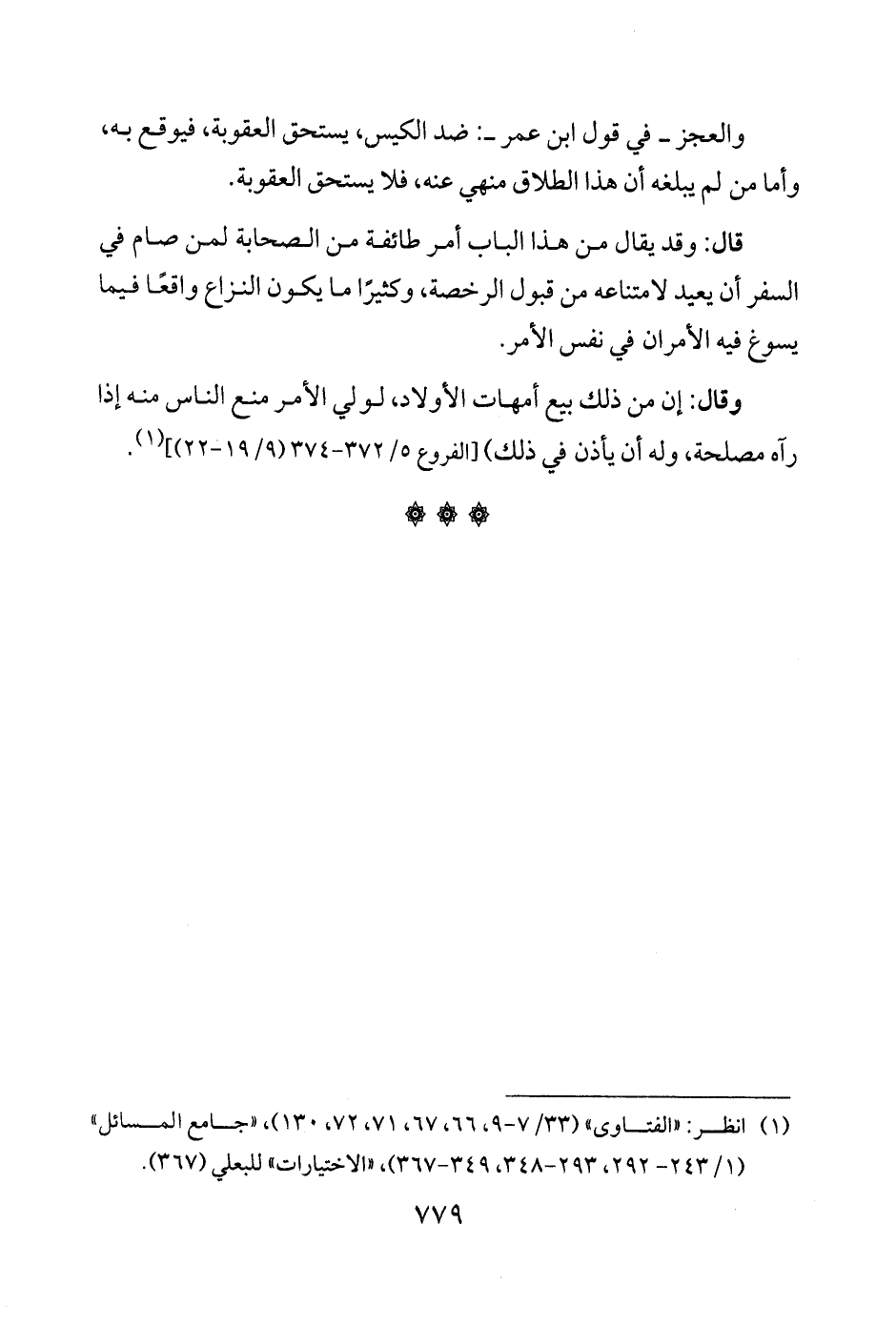 وقال: إن من ذلك بيع أمهات الأولاد، لو لي الأمر منع الناس منه إذا رآه مصلحة، وله أن يأذن في ذلك) [الفروع 5/ 372 - 374 (9/ 19 - 22)] (¬1).