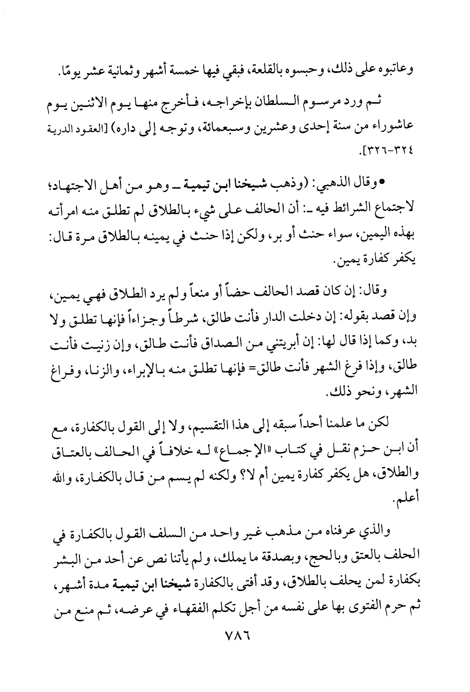 * وقال الذهبي: (وذهب شيخنا ابن تيمية -وهو من أهل الاجتهاد؛ لاجتماع الشرائط فيه-: أن الحالف على شيء بالطلاق لم تطلق منه امرأته بهذه اليمين، سواء حنث أو بر، ولكن إذا حنث في يمينه بالطلاق مرة قال: يكفر كفارة يمين.