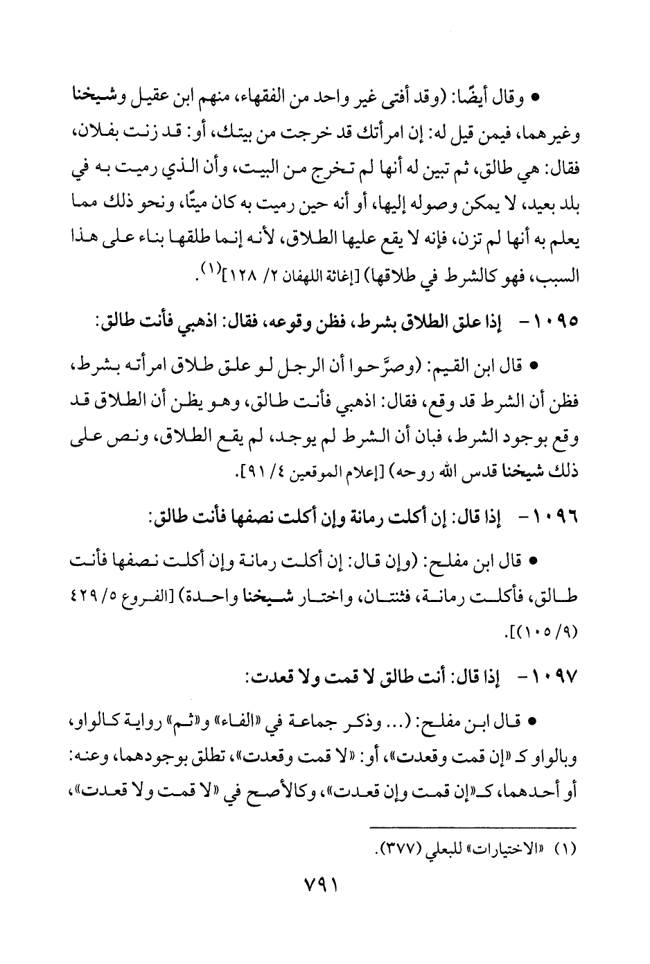 * وقال أيضًا: (وقد أفتى غير واحد من الفقهاء، منهم ابن عقيل وشيخنا وغيرهما، فيمن قيل له: إن امرأتك قد خرجت من بيتك، أو: قد زنت بفلان، فقال: هي طالق، ثم تبين له أنها لم تخرج من البيت، وأن الذي رميت به في بلد بعيد، لا يمكن وصوله إليها، أو أنه حين رميت به كان ميتًا، ونحو ذلك مما يعلم به أنها لم تزن، فإنه لا يقع عليها الطلاق، لأنه إنما طلقها بناء على هذا السبب، فهو كالشرط في طلاقها) [إغاثة اللهفان 2/ 128] (¬1).