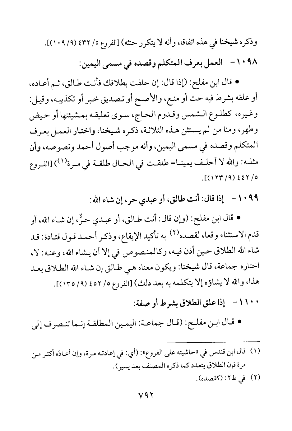 * قال ابن مفلح: (إذا قال: إن حلفت بطلاقك فأنت طالق، ثم أعاده، أو علقه بشرط فيه حث أو منع، والأصح أو تصديق خبر أو تكذيبه، وقيل: وغيره، كطلوع الشمس وقدوم الحاج، سوى تعليقه بمشيئتها أو حيض وطهر، ومنا من لم يستثن هذه الثلاثة، ذكره شيخنا، واختار العمل بعرف المتكلم وقصده في مسمى اليمين، وأنه موجب أصول أحمد ونصوصه، وأن مثله: والله لا أحلف يمينا = طلقت في الحال طلقة في مرة) (¬1) [الفروع 5/ 442 (9/ 123)].
