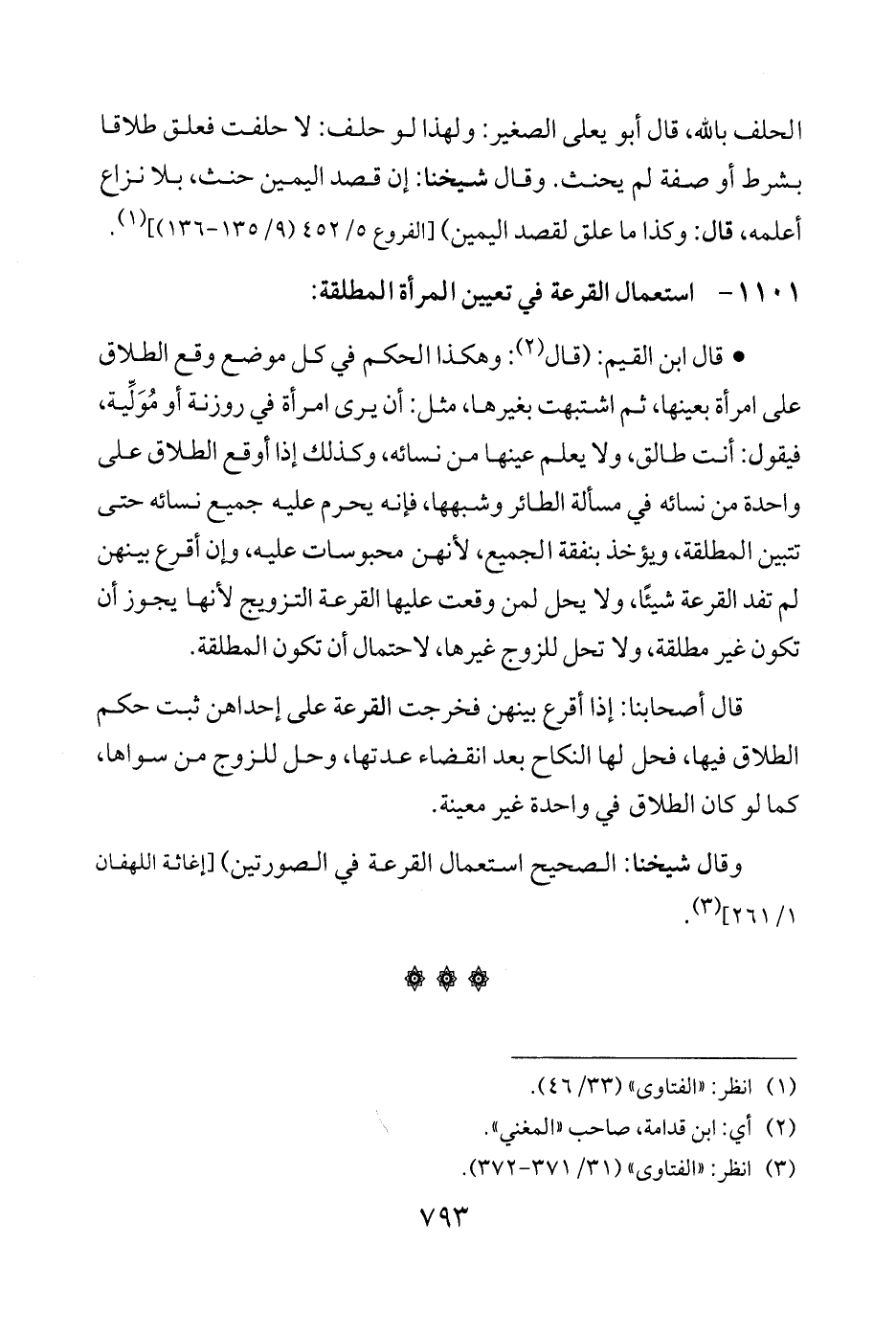 وقال شيخنا: الصحيح استعمال القرعة في الصورتين) [إغاثة اللهفان 1/ 261] (¬3).
