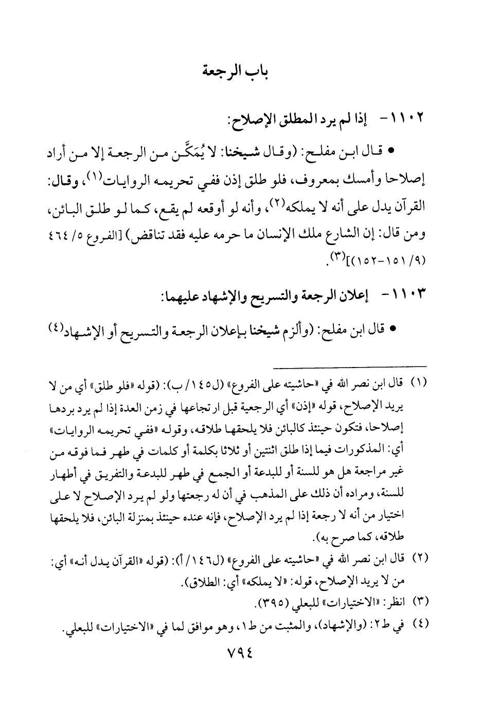 * قال ابن مفلح: (وألزم شيخنا بإعلان الرجعة والتسريح أو الإشهاد (¬4)