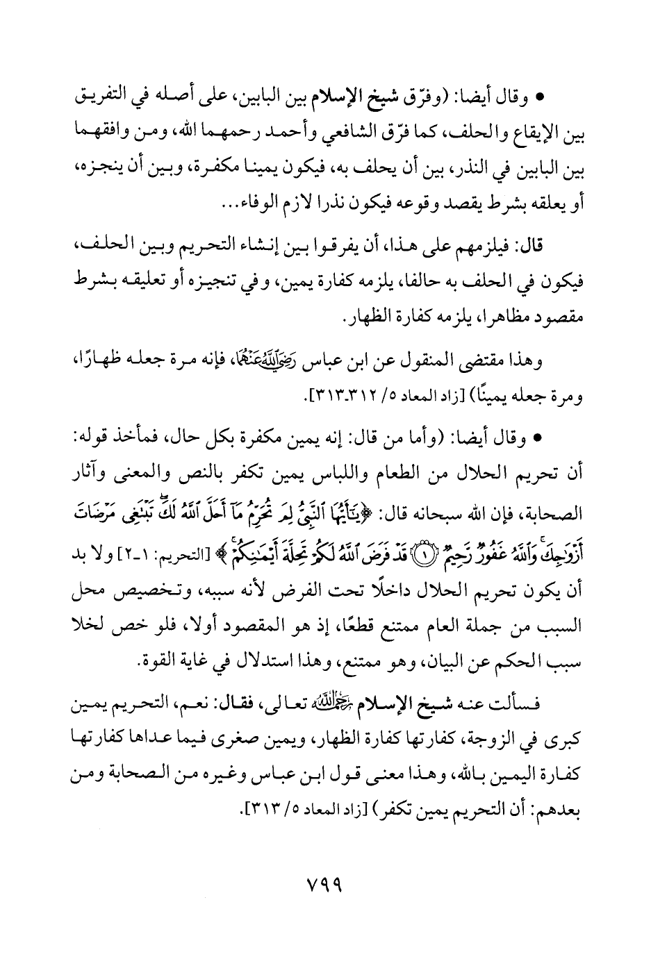 * وقال أيضًا: (وأما من قال: إنه يمين مكفرة بكل حال، فمأخذ قوله: أن تحريم الحلال من الطعام واللباس يمين تكفر بالنص والمعنى وآثار الصحابة، فإن الله سبحانه قال: {يَا أَيُّهَا النَّبِيُّ لِمَ تُحَرِّمُ مَا أَحَلَّ اللَّهُ لَكَ تَبْتَغِي مَرْضَاتَ أَزْوَاجِكَ وَاللَّهُ غَفُورٌ رَحِيمٌ (1) قَدْ فَرَضَ اللَّهُ لَكُمْ تَحِلَّةَ أَيمَانِكُمْ} [التحريم: 1 - 2] ولا بد أن يكون تحريم الحلال داخلًا تحت الفرض لأنه سببه، وتخصيص محل السبب من جملة العام ممتنع قطعًا، إذ هو المقصود أولًا، فلو خص لخلا سبب الحكم عن البيان، وهو ممتنع، وهذا استدلال في غاية القوة.
