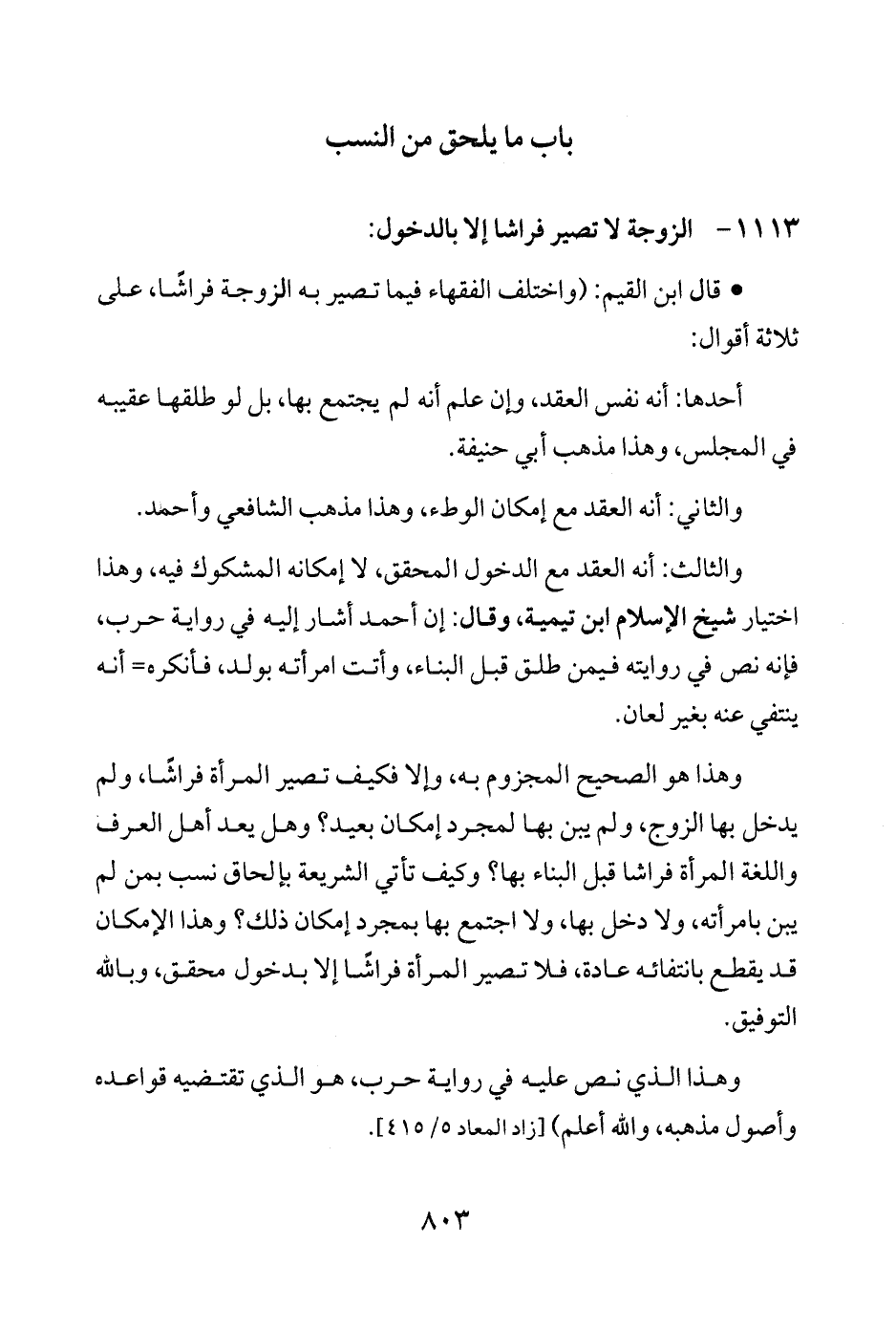 وهذا هو الصحيح المجزوم به، وإلا فكيف تصير المرأة فراشًا، ولم يدخل بها الزوج، ولم يبن بها لمجرد إمكان بعيد؟ وهل يعد أهل العرف واللغة المرأة فراشا قبل البناء بها؟ وكيف تأتي الشريعة بإلحاق نسب بمن لم يبن بامرأته، ولا دخل بها، ولا اجتمع بها بمجرد إمكان ذلك؟ وهذا الإمكان قد يقطع بانتفائه عادة، فلا تصير المرأة فراشًا إلا بدخول محقق، وبالله التوفيق.