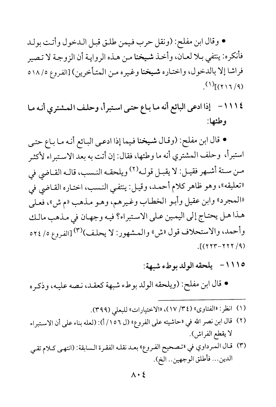 * قال ابن مفلح: (وقال شيخنا فيما إذا ادعى البائع أنه ما باع حتى استبرأ، وحلف المشتري أنه ما وطئها، فقال: إن أتت به بعد الاستبراء لأكثر من ستة أشهر فقيل: لا يقبل قوله (¬2) ويلحقه النسب، قاله القاضي في "تعليقه"، وهو ظاهر كلام أحمد، وقيل: ينتفي النسب، اختاره القاضي في "المجرد" وابن عقيل وأبو لخطاب وغيرهم، وهو مذهب "م ش"، فعلى هذا هل يحتاج إلى اليمين على الاستبراء؟ فيه وجهان في مذهب مالك وأحمد، والاستحلاف قول "ش" والمشهور: لا يحلف) (¬3) [الفروع 5/ 524 (9/ 222 - 223)].