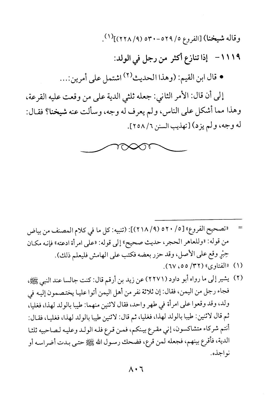(¬2) يشير إلى ما رواه أبو داود (2271) عن زيد بن أرقم قال: كنت جالسا عند النبي - صلى الله عليه وسلم -، فجاء رجل من اليمن، فقال: إن ثلاثة نفر من أهل اليمن أتوا عليا يختصمون إليه في ولد، وقد وقعوا على امرأة في طهر واحد، فقال لاثنين منهما: طيبا بالولد لهذا، فغليا، ثم قال لاثنين: طيبا بالولد لهذا، فغليا، ثم قال: لاثنين طيبا بالولد لهذا، فغليا، فقال: أنتم شركاء متشاكسون، إني مقرع بينكم، فمن قرع فله الولد وعليه لصاحبيه ثلثا الدية، فأقرع بينهم، فجعله لمن قرع، فضحك رسول الله - صلى الله عليه وسلم - حتى بدت أضراسه أو نواجذه.