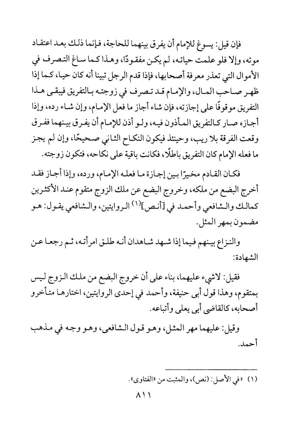 فإن قيل: يسوغ للإمام أن يفرق بينهما للحاجة، فإنما ذلك بعد اعتقاد موته، وإلا فلو علمت حياته، لم يكن مفقودًا، وهذا كما ساغ التصرف في الأموال التي تعذر معرفة أصحابها، فإذا قدم الرجل تبينا أنه كان حيا، كما إذا ظهر صاحب المال، والإمام قد تصرف في زوجته بالتفريق فيبقى هذا التفريق موقوفًا على إجازته، فإن شاء أجاز ما فعل الإمام، وإن شاء رده، وإذا أجازه صار كالتفريق المأذون فيه، ولو أذن للإمام أن يفرق بينهما ففرق وقعت الفرقة بلا ريب، وحينئذ فيكون النكاح الثاني صحيحًا، وإن لم يجز ما فعله الإمام كان التفريق باطلًا، فكانت باقية على نكاحه، فتكون زوجته.