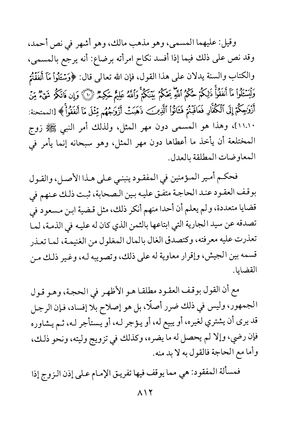 فحكم أمير المؤمنين في المفقود ينبني على هذا الأصل, والقول بوقف العقود عند الحاجة متفق عليه بين الصحابة، ثبت ذلك عنهم في قضايا متعددة، ولم يعلم أن أحدا منهم أنكر ذلك، مثل قضية ابن مسعود في تصدقه عن سيد الجارية التي ابتاعها بالثمن الذي كان له عليه في الذمة، لما تعذرت عليه معرفته، وكتصدق الغال بالمال المغلول من الغنيمة، لما تعذر قسمه بين الجيش، وإقرار معاوية له على ذلك، وتصويبه له، وغير ذلك من القضايا.