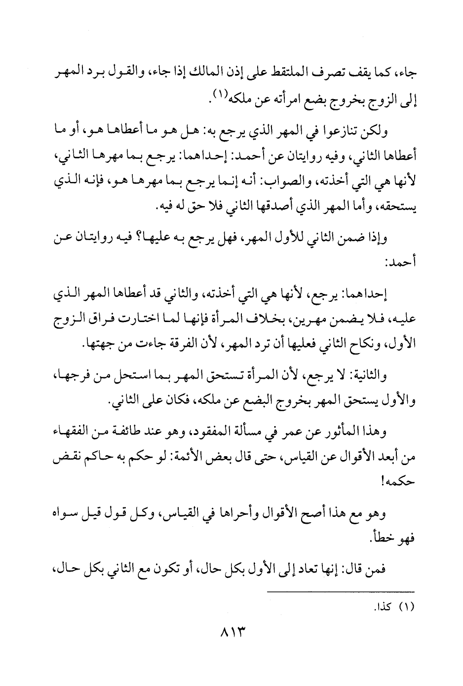 جاء، كما يقف تصرف الملتقط على إذن المالك إذا جاء، والقول برد المهر إلى الزوج بخروج بضع امرأته عن ملكه (¬1).