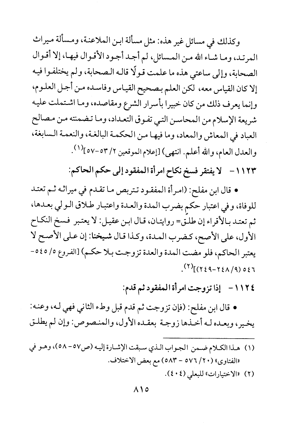 1123 - لا يفتقر فسخ نكاح امرأة المفقود إلى حكم الحاكم: