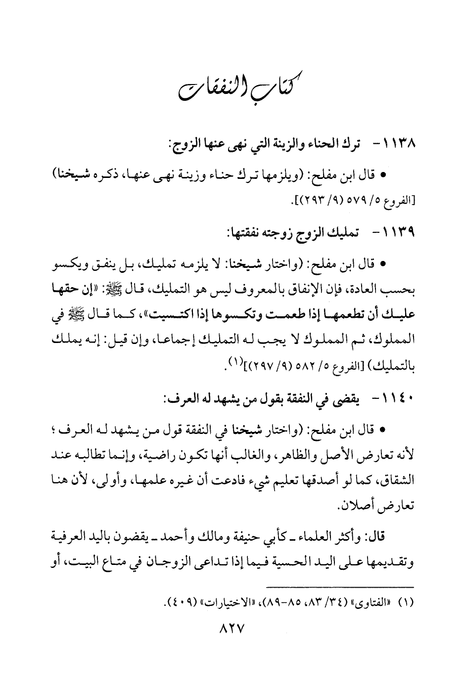 * قال ابن مفلح: (واختار شيخنا: لا يلزمه تمليك، بل ينفق ويكسو بحسب العادة، فإن الإنفاق بالمعروف ليس هو التمليك، قال - صلى الله عليه وسلم - "إن حقها عليك أن تطعمها إذا طعمت وتكسوها إذا اكتسيت"، كما قال - صلى الله عليه وسلم - في المملوك، ثم المملوك لا يجب له التمليك إجماعا، وإن قيل: إنه يملك بالتمليك) [الفروع 5/ 582 (9/ 297)] (¬1).