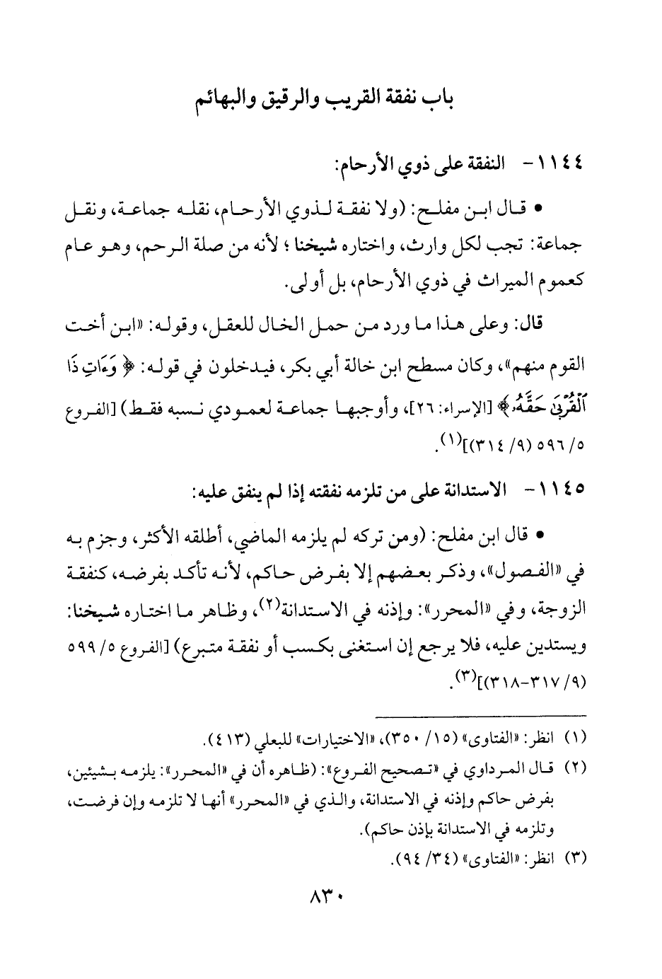 * قال ابن مفلح: (ولا نفقة لذوي الأرحام، نقله جماعة، ونقل جماعة: تجب لكل وارث، واختاره شيخنا؛ لأنه من صلة الرحم، وهو عام كعموم الميراث في ذوي الأرحام، بل أولى.