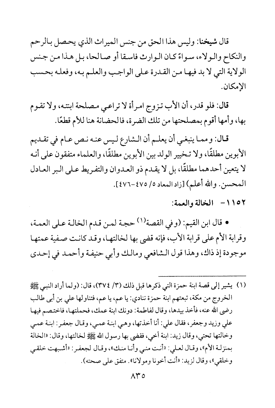 (¬1) يشير إلى قصة ابنة حمزة التي ذكرها قبل ذلك (3/ 374)، قال: (ولما أراد النبي - صلى الله عليه وسلم - الخروج من مكة، تبعتهم ابنة حمزة تنادي: يا عم، يا عم، فتناولها علي بن أبي طالب رضي الله عنه، فأخذ بيدها، وقال لفاطمة: دونك ابنة عمك، فحملتها، فاختصم فيها على وزيد وجعفر، فقال علي: أنا أخذتها، وهي ابنة عمي، وقال جعفر: ابنة عمي وخالتها تحتي، وقال زيد: ابنة أخي، فقضى بها رسول الله لخالتها، وقال: "الخالة بمنزلة الأم"، وقال لعلي: "أنت مني وأنا منك"، وقال لجعفر: "أشبهت خلقي وخلقي"، وقال لزيد، "أنت أخونا ومولانا". متفق على صحته).