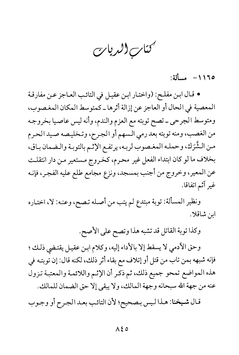 * قال ابن مفلح: (واختار ابن عقيل في التائب العاجز عن مفارقة المعصية في الحال أو العاجز عن إزالة أثرها -كمتوسط المكان المغصوب، ومتوسط الجرحى- تصح توبته مع العزم والندم، وأنه ليس عاصيا بخروجه من الغصب، ومنه توبته بعد رمي السهم أو الجرح، وتخليصه صيد الحرم من الشَّرَك، وحمله المغصوب لربه، يرتفع الإثم بالتوبة والضمان باق، بخلاف ما لو كان ابتداء الفعل غير محرم، كخروج مستعير من دار انتقلت عن المعير، وخروج من أجنب بمسجد، ونزع مجامع طلع عليه الفجر، فإنه غير آثم اتفاقا.
