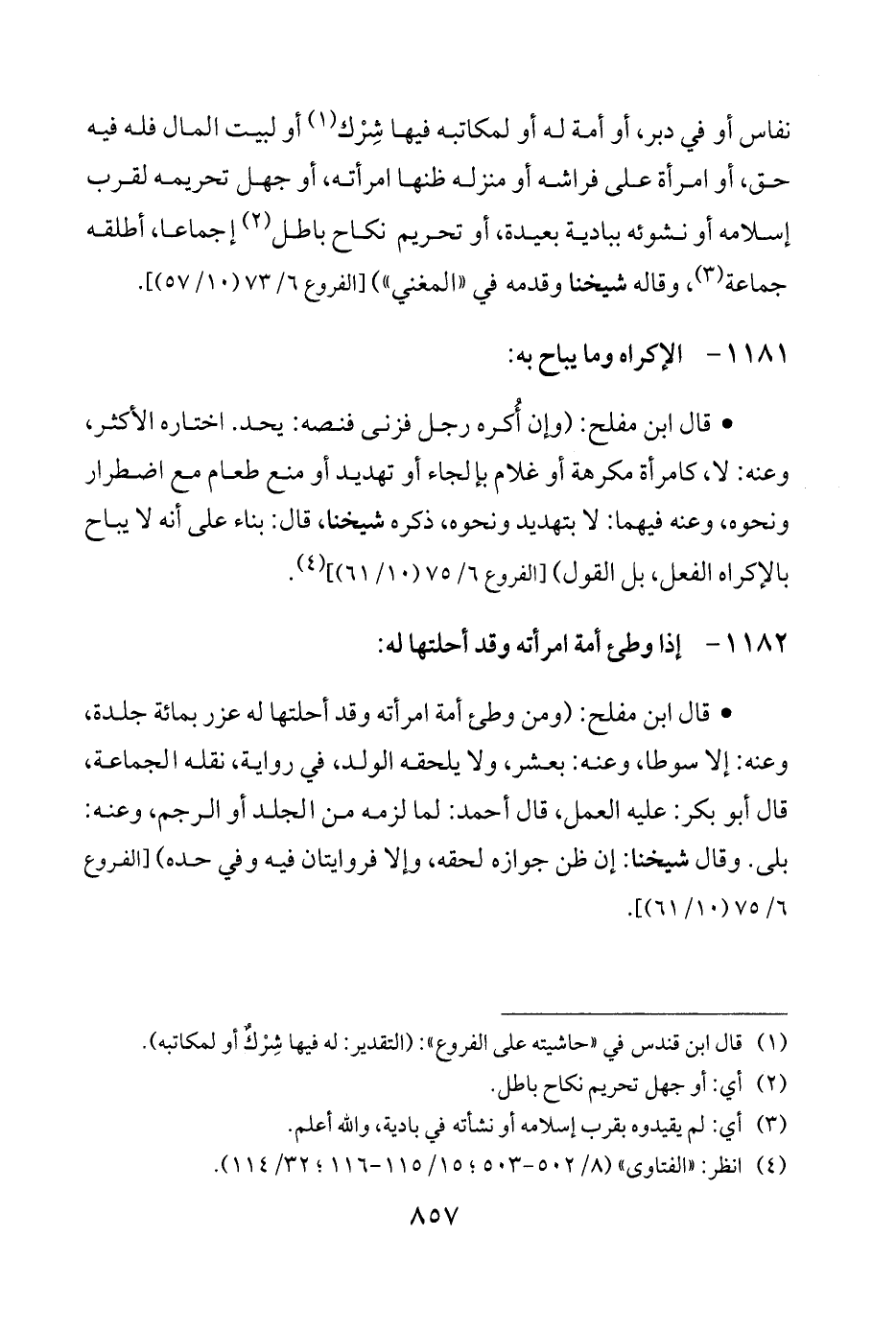 نفاس أو في دبر، أو أمة له أو لمكاتبه فيها شِرْك (¬1) أو لبيت المال فله فيه حق، أو امرأة على فراشه أو منزله ظنها امرأته، أو جهل تحريمه لقرب إسلامه أو نشوئه ببادية بعيدة، أو تحريم نكاح باطل (¬2) إجماعا، أطلقه جماعة (¬3)، وقاله شيخنا وقدمه في "المغني" [الفروع 6/ 73 (10/ 57)].