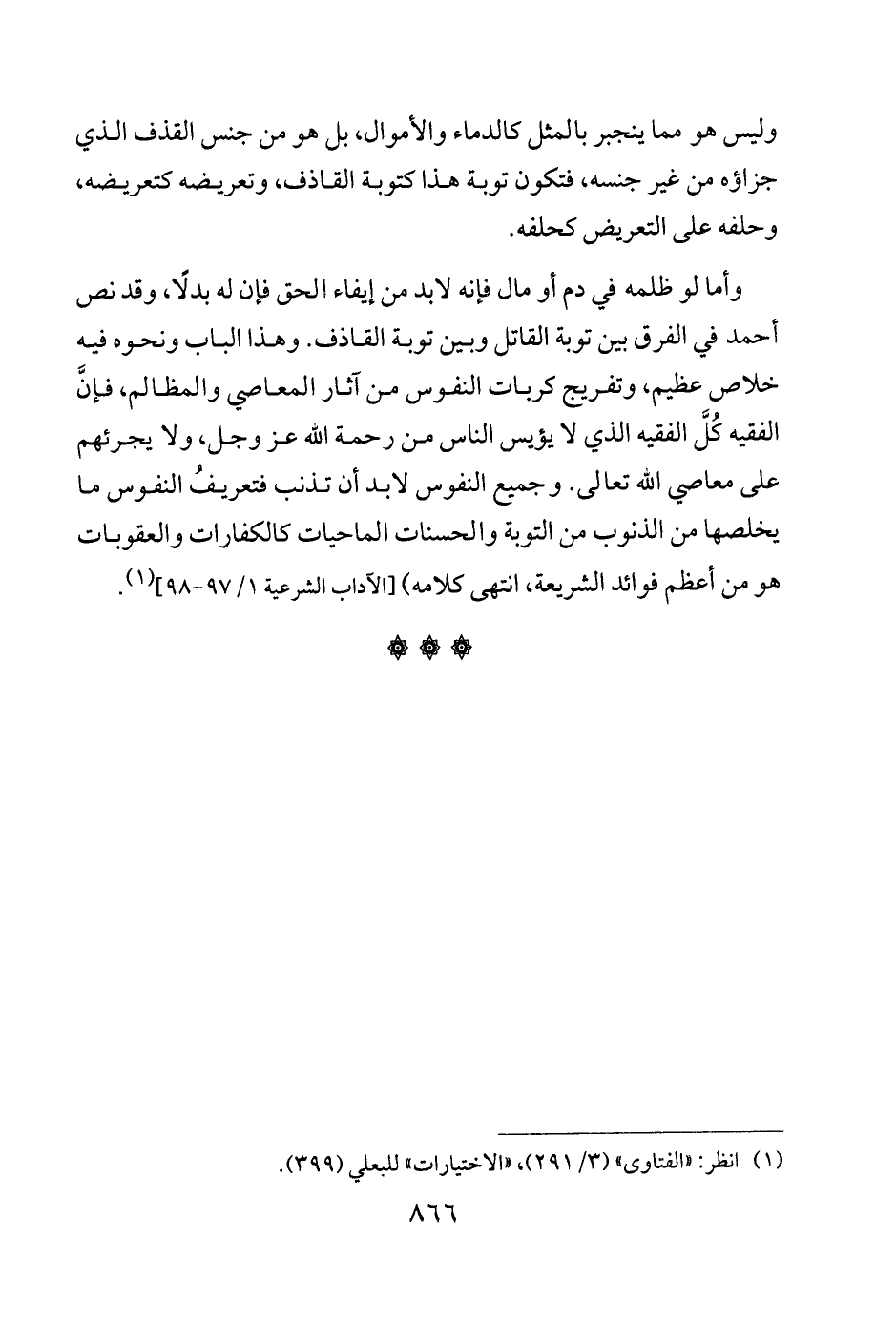 وأما لو ظلمه في دم أو مال فإنه لا بد من إيفاء الحق فإن له بدلًا، وقد نص أحمد في الفرق بين توبة القاتل وبين توبة القاذف. وهذا الباب ونحوه فيه خلاص عظيم، وتفريج كربات النفوس من آثار المعاصي والمظالم، فإنَّ الفقيه كُلَّ الفقيه الذي لا يؤيس الناس من رحمة الله عزَّ وجلَّ، ولا يجرئهم على معاصي الله تعالى. وجميع النفوس لا بد أن تذنب فتعريفُ النفوس ما يخلصها من الذنوب من التوبة والحسنات الماحيات كالكفارات والعقوبات هو من أعظم فوائد الشريعة، انتهى كلامه) [الآداب الشرعية 1/ 97 - 98] (¬1).