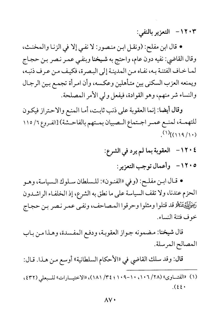 • قال ابن مفلح: (وفي "الفنون": للسلطان سلوك السياسة، وهو الحزم عندنا، ولا تقف السياسة على ما نطق به الشرع، إذ الخلفاء الراشدون -رضي الله عنهم- قد قتلوا ومثلوا وحرقوا المصاحف، ونفي عمر نصر بن حجاج خوف فتنة النساء.