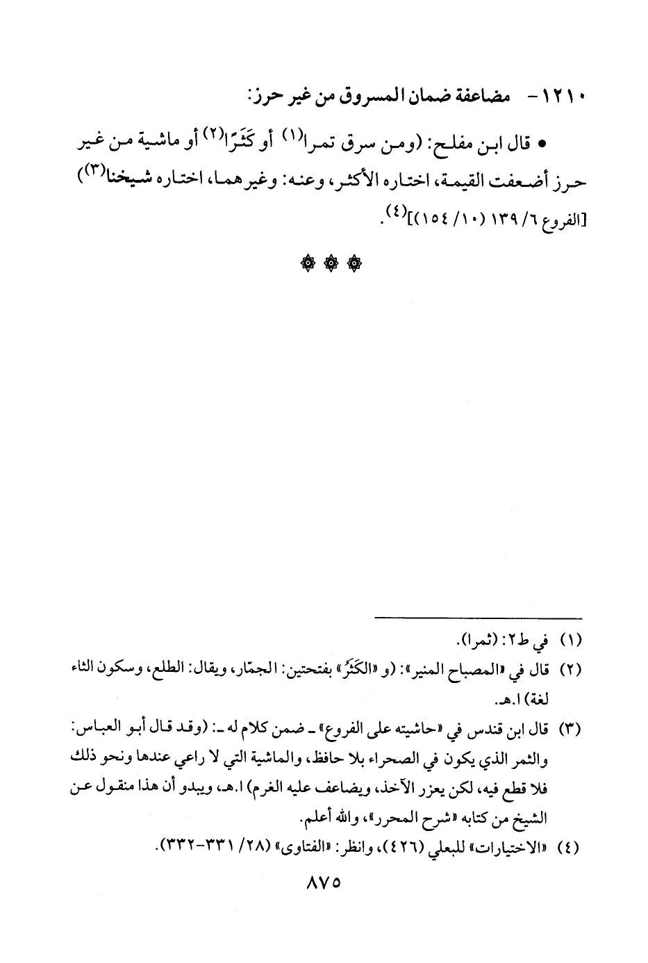 (¬3) قال ابن قندس في "حاشيته على الفروع" -ضمن كلام له-: (وقد قال أبو العباس: والثمر الذي يكون في الصحراء بلا حافظ، والماشية التي لا راعي عندها ونحو ذلك فلا قطع فيه، لكن يعزر الآخذ، ويضاعف عليه الغرم) ا. هـ، ويبدو أن هذا منقول عن الشيخ من كتابه "شرح المحرر"، والله أعلم.