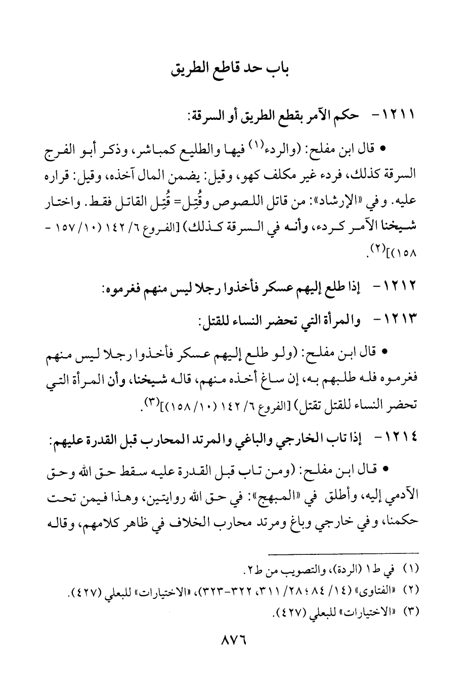 • قال ابن مفلح: (والردء (¬1) فيها والطليع كمباشر، وذكر أبو الفرج السرقة كذلك، فردء غير مكلف كهو، وقيل: يضمن المال آخذه، وقيل: قراره عليه. وفي "الإرشاد": من قاتل اللصوص وقُتِل = قُتِل القاتل فقط. واختار شيخنا الآمر كردء، وأنه في السرقة كذلك) [الفروع 6/ 142 (10/ 157 - 158)] (¬2).
