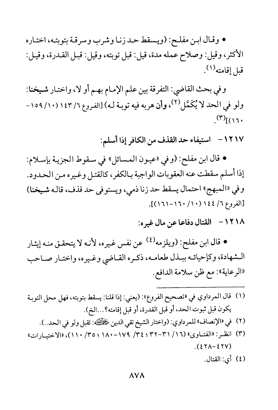 • قال ابن مفلح: (وفي "عيون المسائل" في سقوط الجزية بإسلام: إذا أسلم سقطت عنه العقوبات الواجبة بالكفر، كالقتل وغيره من الحدود. وفي "المبهج" احتمال يسقط حد زنا ذمي، ويستوفى حد قذف، قاله شيخنا) [الفروع 6/ 144 (10/ 160 - 161)].