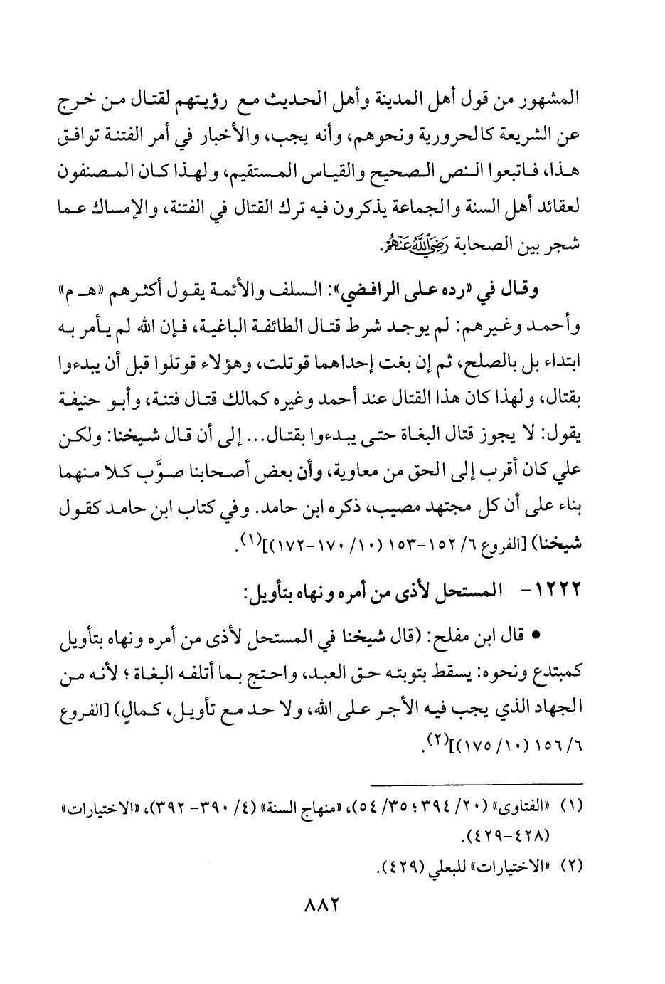 المشهور من قول أهل المدينة وأهل الحديث مع رؤيتهم لقتال من خرج عن الشريعة كالحرورية ونحوهم، وأنه يجب، والأخبار في أمر الفتنة توافق هذا، فاتبعوا النص الصحيح والقياس المستقيم، ولهذا كان المصنفون لعقائد أهل السنة والجماعة يذكرون فيه ترك القتال في الفتنة، والإمساك عما شجر بين الصحابة - رضي الله عنهم -.