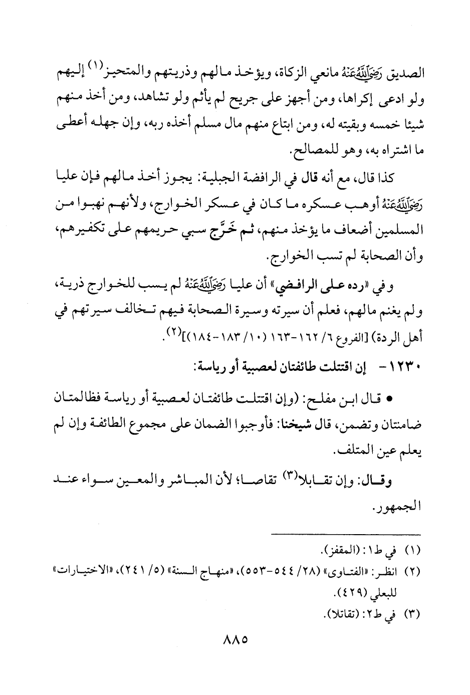• قال ابن مفلح: (وإن اقتتلت طائفتان لعصبية أو رياسة فظالمتان ضامنتان وتضمن، قال شيخنا: فأوجبوا الضمان على مجموع الطائفة وإن لم يعلم عين المتلف.