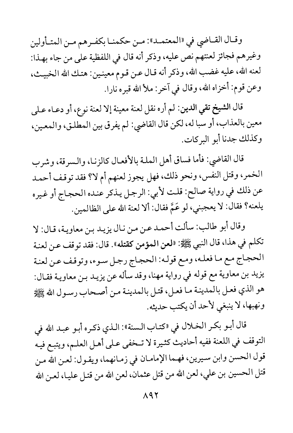 وقال أبو طالب: سألت أحمد عن من نال يزيد بن معاوية، قال: لا تكلم في هذا، قال النبي - صلى الله عليه وسلم -: "لعن المؤمن كقتله". قال: فقد توقف عن لعنة الحجاج مع ما فعله، ومع قوله: الحجاج رجل سوء، وتوقف عن لعنة يزيد بن معاوية مع قوله في رواية مهنا، وقد سأله عن يزيد بن معاوية فقال: هو الذي فعل بالمدينة ما فعل، قتل بالمدينة من أصحاب رسول الله - صلى الله عليه وسلم - ونهبها، لا ينبغي لأحد أن يكتب حديثه.