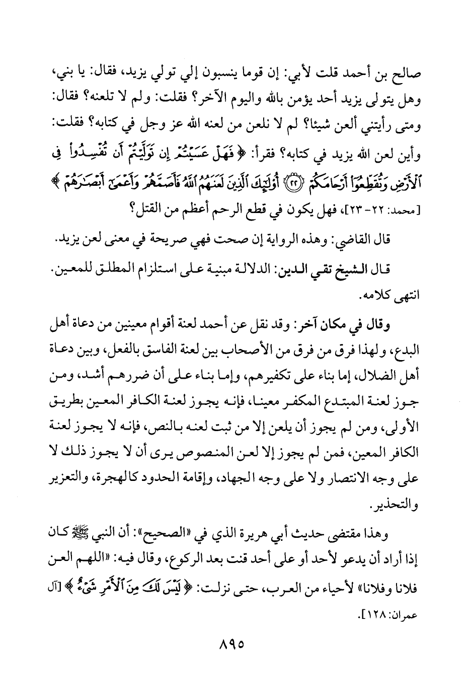 صالح بن أحمد قلت لأبي: إن قوما ينسبون إلي تولي يزيد، فقال: يا بني، وهل يتولى يزيد أحد يؤمن بالله واليوم الآخر؟ فقلت: ولم لا تلعنه؟ فقال: ومتى رأيتني ألعن شيئًا؟ لم لا نلعن من لعنه الله عزَّ وجلَّ في كتابه؟ فقلت: وأين لعن الله يزيد في كتابه؟ فقرأ: {فَهَلْ عَسَيتُمْ إِنْ تَوَلَّيتُمْ أَنْ تُفْسِدُوا فِي الْأَرْضِ وَتُقَطِّعُوا أَرْحَامَكُمْ (22) أُولَئِكَ الَّذِينَ لَعَنَهُمُ اللَّهُ فَأَصَمَّهُمْ وَأَعْمَى أَبْصَارَهُمْ} [محمد: 22 - 23]، فهل يكون في قطع الرحم أعظم من القتل؟