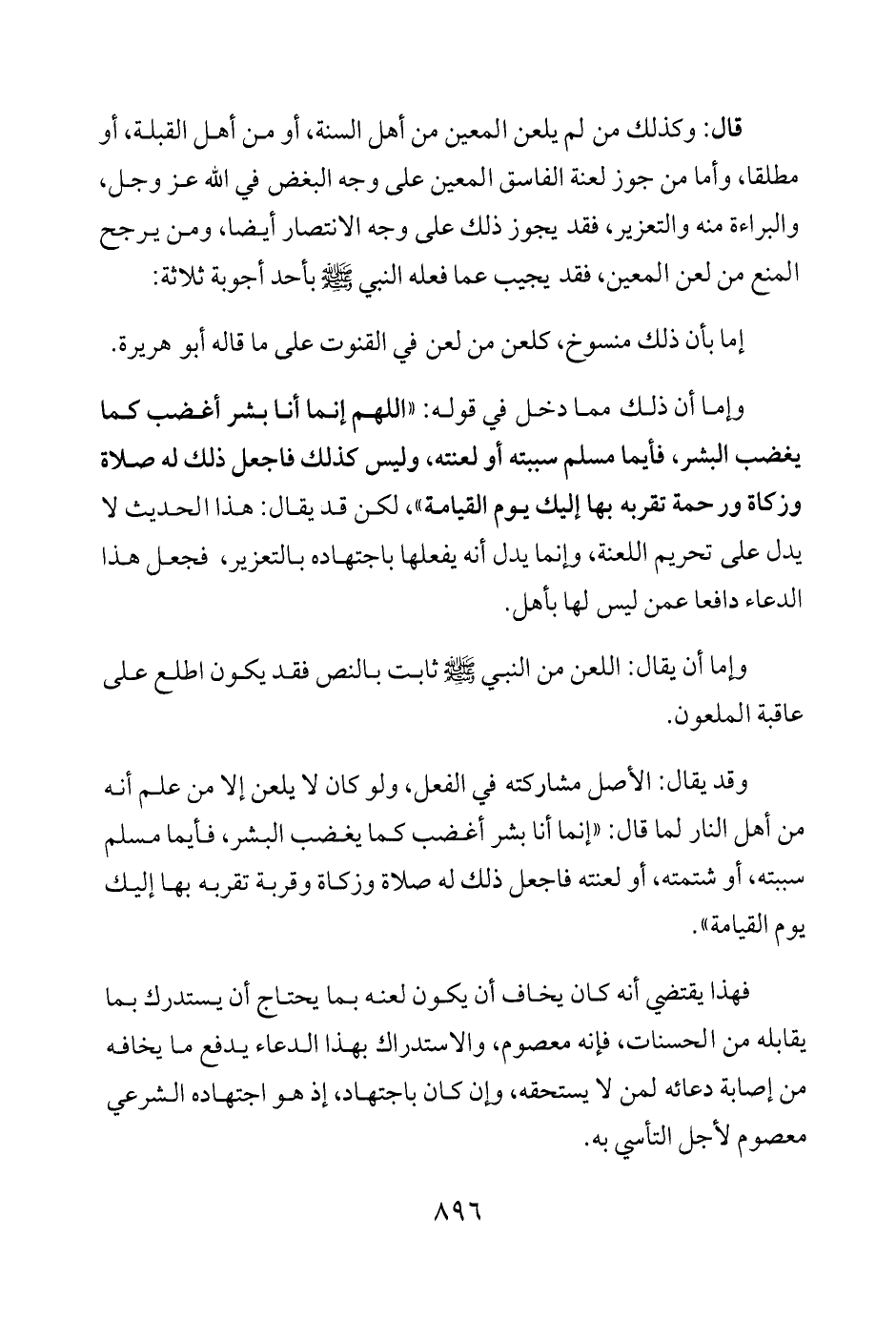 قال: وكذلك من لم يلعن المعين من أهل السنة، أو من أهل القبلة، أو مطلقا، وأما من جوز لعنة الفاسق المعين على وجه البغض في الله عزَّ وجلَّ، والبراءة منه والتعزير، فقد يجوز ذلك على وجه الانتصار أيضًا، ومن يرجح المنع من لعن المعين، فقد يجيب عما فعله النبي - صلى الله عليه وسلم - بأحد أجوبة ثلاثة: