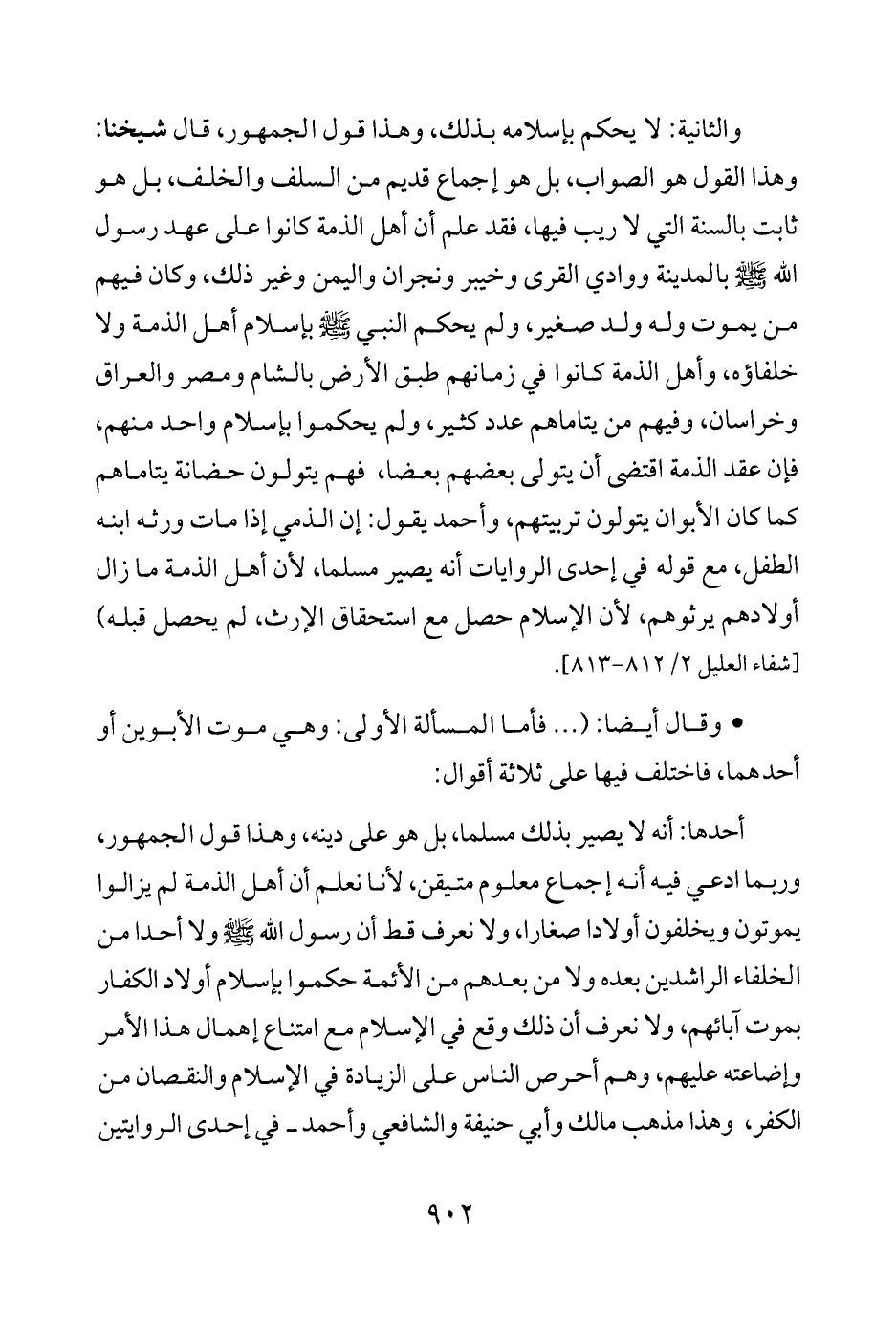 والثانية: لا يحكم بإسلامه بذلك، وهذا قول الجمهور، قال شيخنا: وهذا القول هو الصواب، بل هو إجماع قديم من السلف والخلف، بل هو ثابت بالسنة التي لا ريب فيها، فقد علم أن أهل الذمة كانوا على عهد رسول الله - صلى الله عليه وسلم - بالمدينة ووادي القرى وخيبر ونجران واليمن وغير ذلك، وكان فيهم من يموت وله ولد صغير، ولم يحكم النبي - صلى الله عليه وسلم - بإسلام أهل الذمة ولا خلفاؤه، وأهل الذمة كانوا في زمانهم طبق الأرض بالشام ومصر والعراق وخراسان، وفيهم من يتاماهم عدد كثير، ولم يحكموا بإسلام واحد منهم، فإن عقد الذمة اقتضى أن يتو لي بعضهم بعضا، فهم يتولون حضانة يتاماهم كما كان الأبوان يتولون تربيتهم، وأحمد يقول: إن الذمي إذا مات ورثه ابنه الطفل، مع قوله في إحدى الروايات أنه يصير مسلما، لأن أهل الذمة ما زال أولادهم يرثوهم، لأن الإسلام حصل مع استحقاق الإرث، لم يحصل قبله) [شفاء العليل 2/ 812 - 813].
