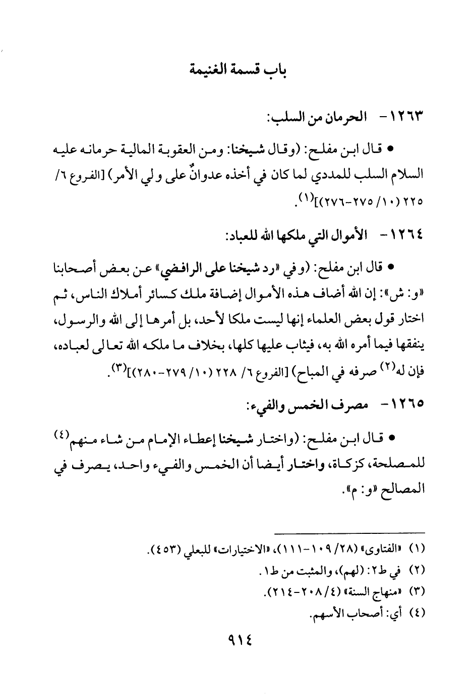• قال ابن مفلح: (وفي "رد شيخنا على الرافضي" عن بعض أصحابنا "و: ش": إن الله أضاف هذه الأموال إضافة ملك كسائر أملاك الناس، ثم اختار قول بعض العلماء إنها ليست ملكا لأحد، بل أمرها إلى الله والرسول، ينفقها فيما أمره الله به، فيثاب عليها كلها، بخلاف ما ملكه الله تعالى لعباده، فإن له (¬2) صرفه في المباح) [الفروع 6/ 228 (10/ 279 - 285)] (¬3).