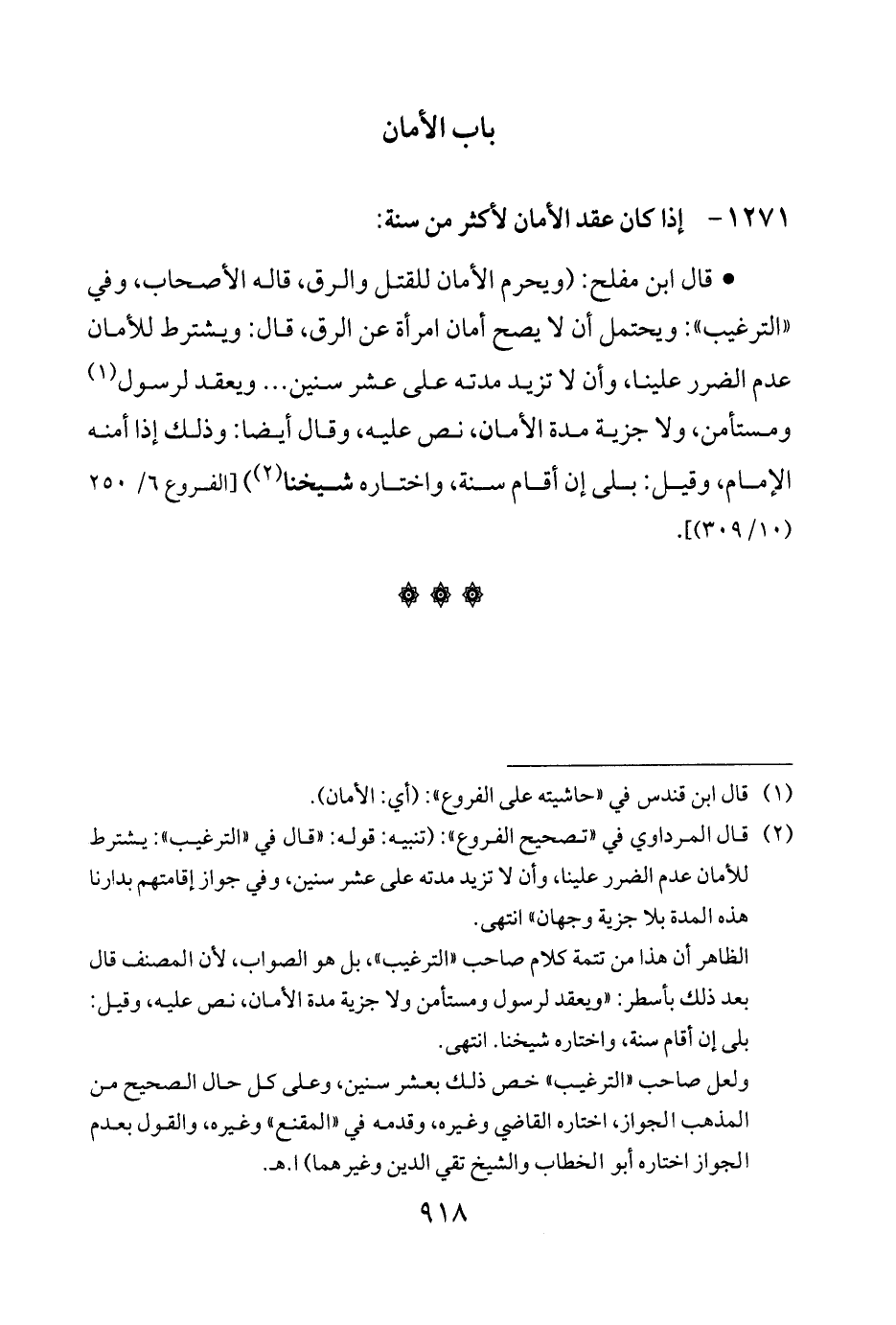 (¬2) قال المرداوي في "تصحيح الفروع": (تنبيه: قوله: "قال في "الترغيب": يشترط للأمان عدم الضرر علينا، وأن لا تزيد مدته على عشر سنين، وفي جواز إقامتهم بدارنا هذه المدة بلا جزية وجهان" انتهى.